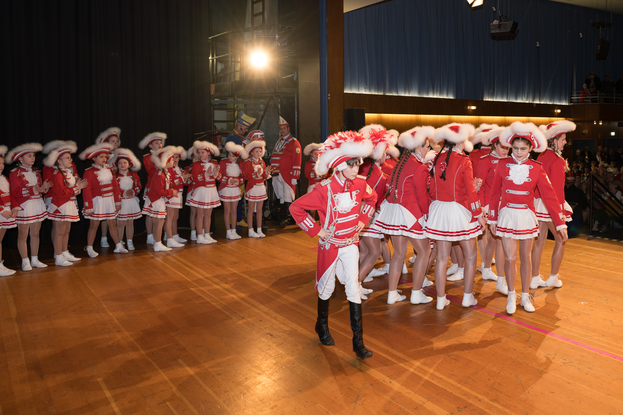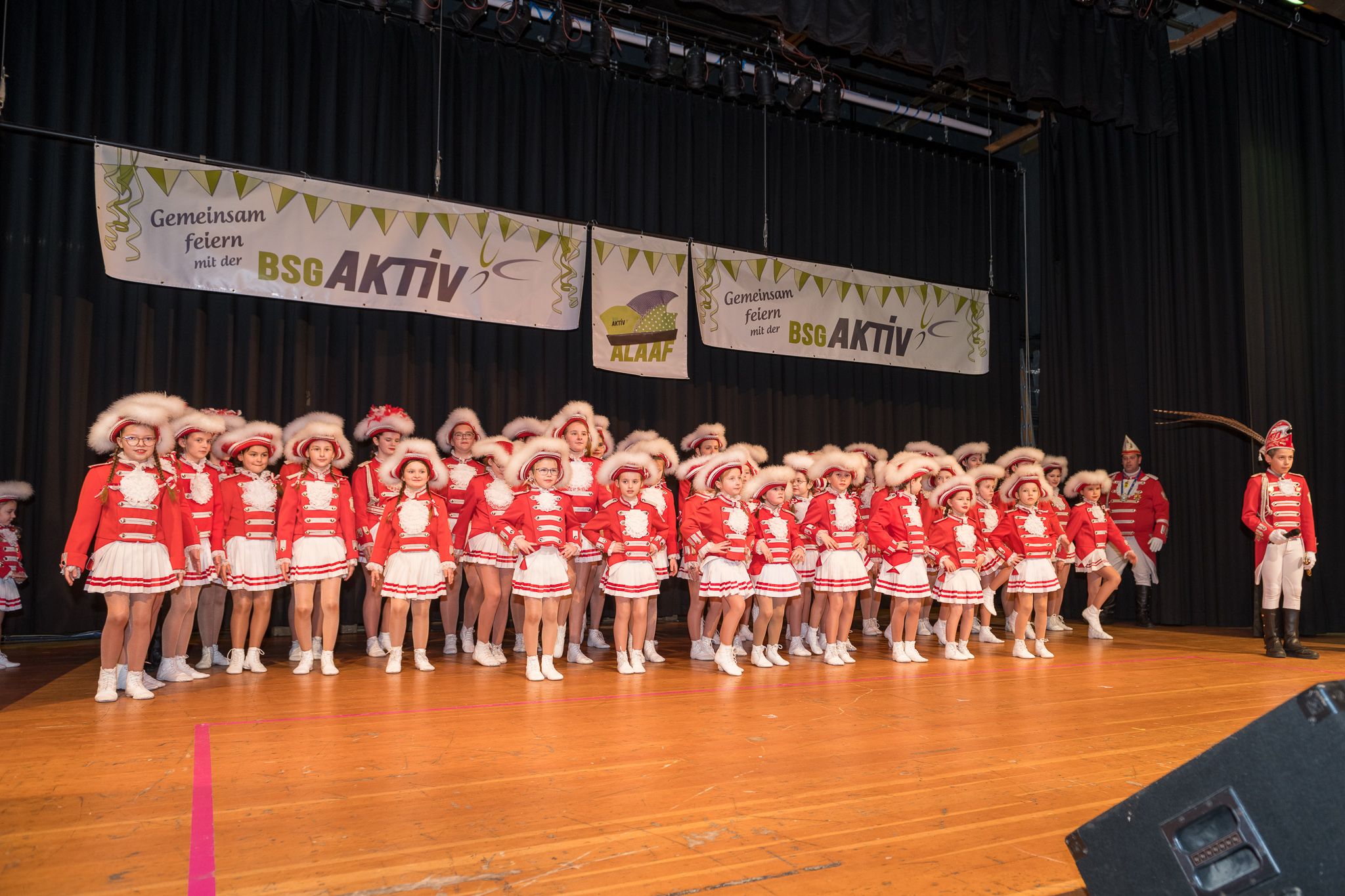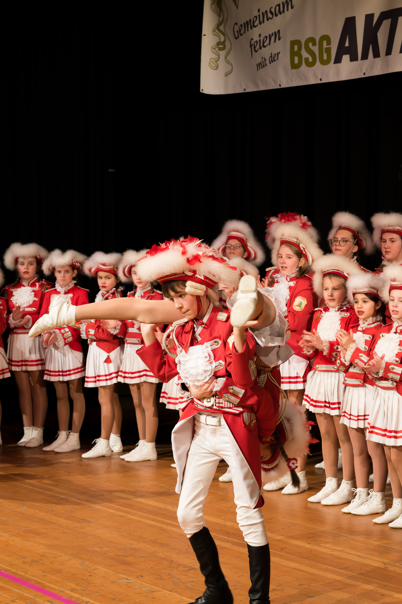 Die Kinder- und Jugendgarde der KG Eefelkank marschierte pünktlich auf und zeigte mit einer großen Anzahl an Kindern und Jugendlichen, dass die Gesellschaft sich um den Nachwuchs keine Sorgen machen muss. Die Einzel- und Gardetänze kamen beim Publikum gut an und der Saal war gut auf den Besuch von Prinz Frank II und seinem Zeremonienmeister Juppi nebst Gefolge eingestimmt. Anschließend jagte ein weiterer Programmhöhepunkt den nächsten, das Trompeterkorps Eefelkank, seit Jahren ein Garant für gute Stimmung bei der BSG, holte die Gäste in kürzester Zeit von den Stühlen. Ein grandioser Auftritt des Tanzcorps Colonia Ruut Wiess folgte, diese Truppe wird bestimmt nicht das letzte Mal bei der BSG aufgetreten sein. Max Biermann schlug anschließend mit seiner "Flitsch" etwas ruhigere Töne an, was der Stimmung im kräftig mitsingenden Publikum jedoch keineswegs Abbruch tat. Die Original Eschweiler heizten die Temperatur dann wieder an, so dass erste Gäste sich nur darüber beschwerten, vor lauter Klatschen würden ihnen langsam die Hände schmerzen. Das Tanzkorps Blue Royal aus Stolberg hatte jedoch kein Mitleid, auch diese Tanzgruppe wurde vom Publikum gefeiert. Kaum waren die Tänzerinnen und Tänzer von der Bühne, begann ein Einmarsch der Extrakasse. Das Reiter-Korps Jan von Werth, angekündigt und in den Saal gespielt von der eigenen Korps-Kapelle, besuchte zum zweiten Mal die Sitzung der BSG. Gut 4 Minuten dauerte es, bis alle Aktiven auf der Bühne aufmarschiert waren.