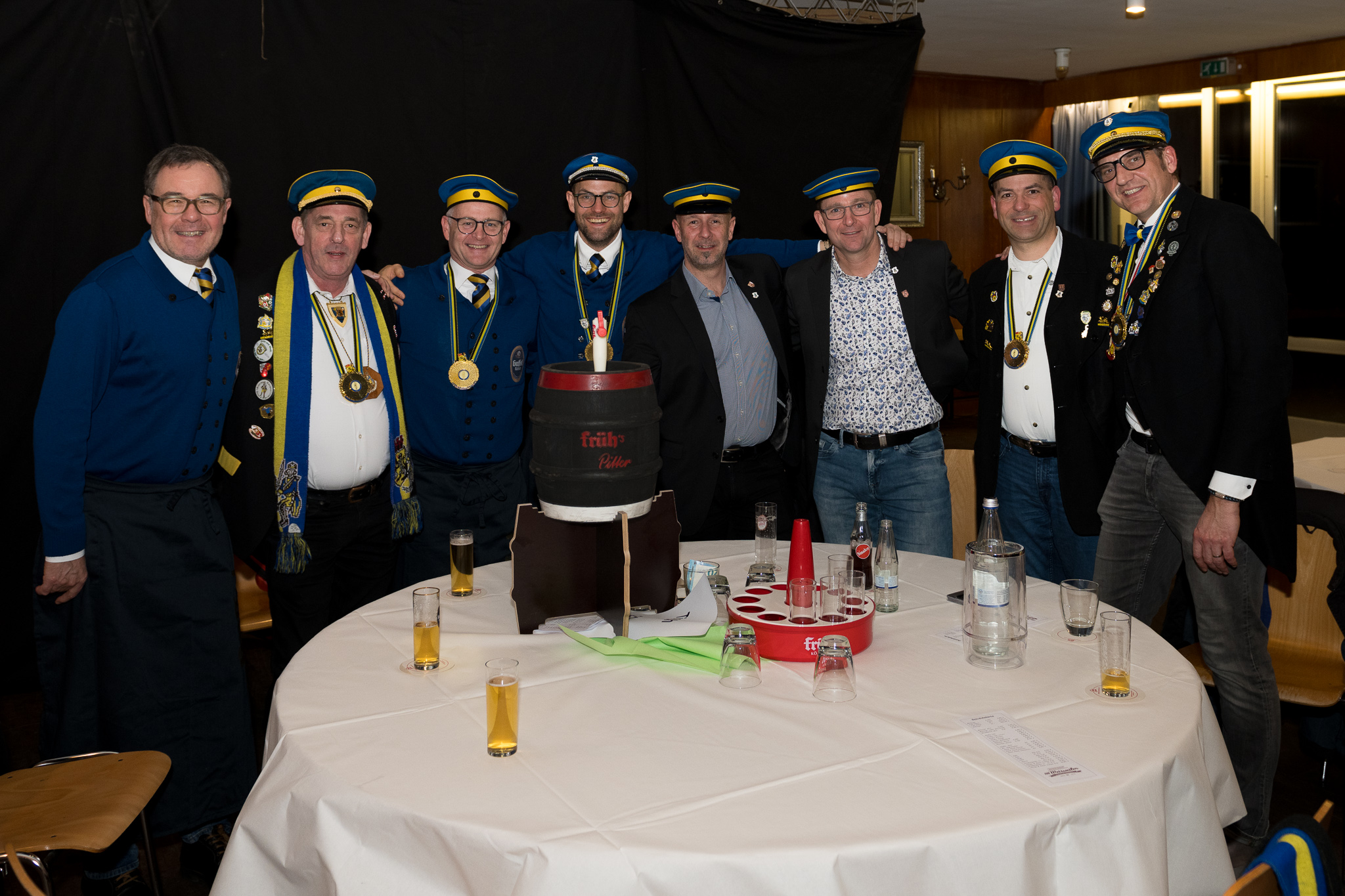 Nach einem solchen Auftritt ist es für manche Künstler schwer, sich auf der Bühne zu präsentieren. Nicht so für jedoch für das Tanzcorps Höppe Kroetsch, das als Überraschungsgäste die Castle Pipers aus Wegberg dabeihatte. Auf die Bühne gespielt von Dudelsäcken und Trommeln begeisterten die Höppe Kroetsch beim Heimspiel in Weisweiler erneut das Publikum. Zwischen den Tänzen zeigten die Castle Pipers, dass manches bekannte Karnevalslied ursprünglich aus Schottland kommt und spielten z.B. Highland Cathedral, den Karnevalisten in der Fassung der Bläck Föös mit dem Titel "Du bes die Stadt" bestens bekannt. So sang der Saal zu den Klängen der Castle Pipers und die Höppe Kroetsch konnten ein wenig durchatmen, bis sie nach dem Haupttanz und dem zweiten Tanz auch noch die vom Publikum begeistert eingeforderte Zugabe boten. Gegen 23.15 Uhr verabschiedete sich Christoph Herzog vom Publikum mit den Worten "Wenn es Euch gefallen hat, kommt gerne wieder. Wir feiern das nächste Mal am 23.01.2026".