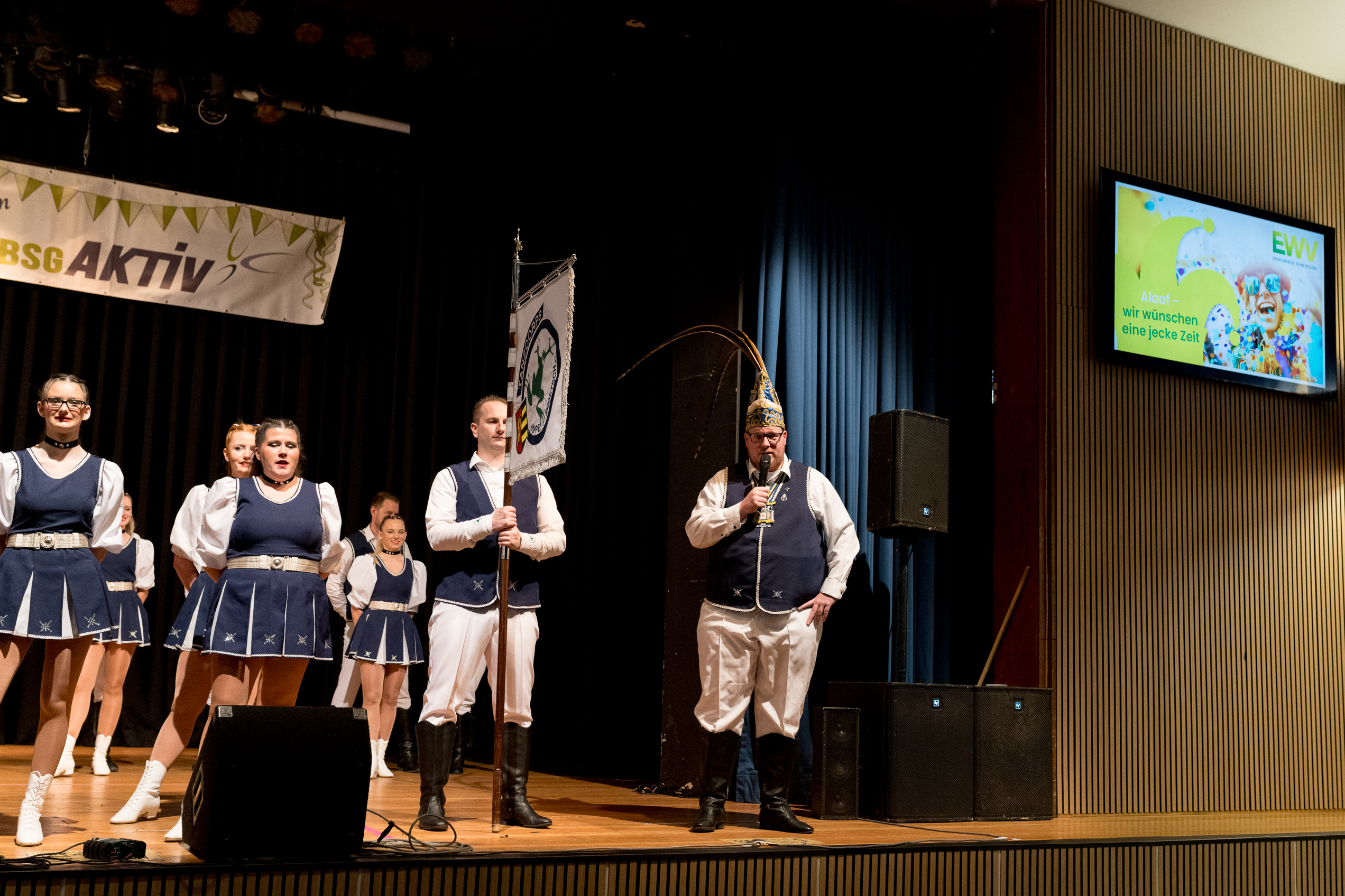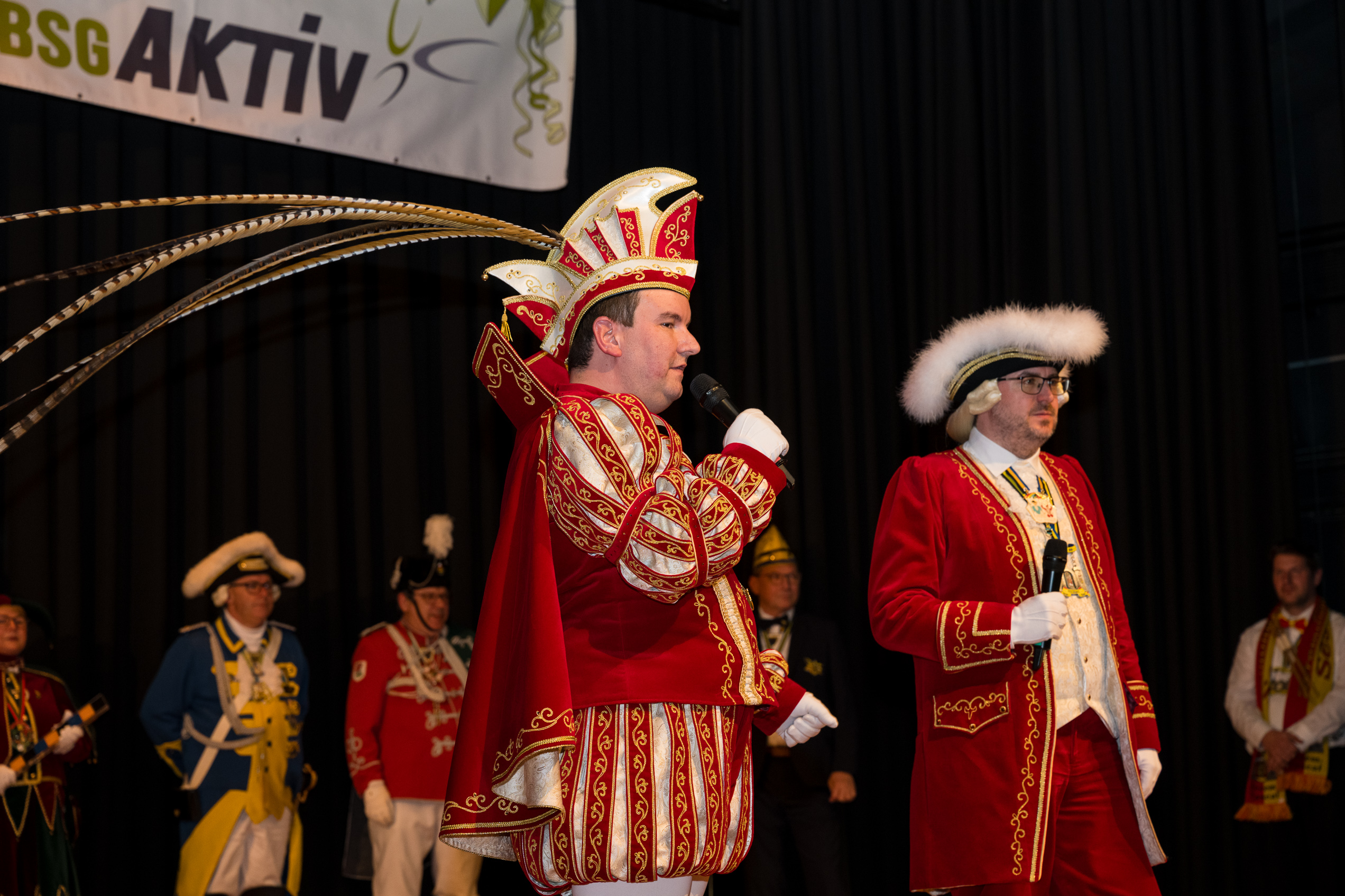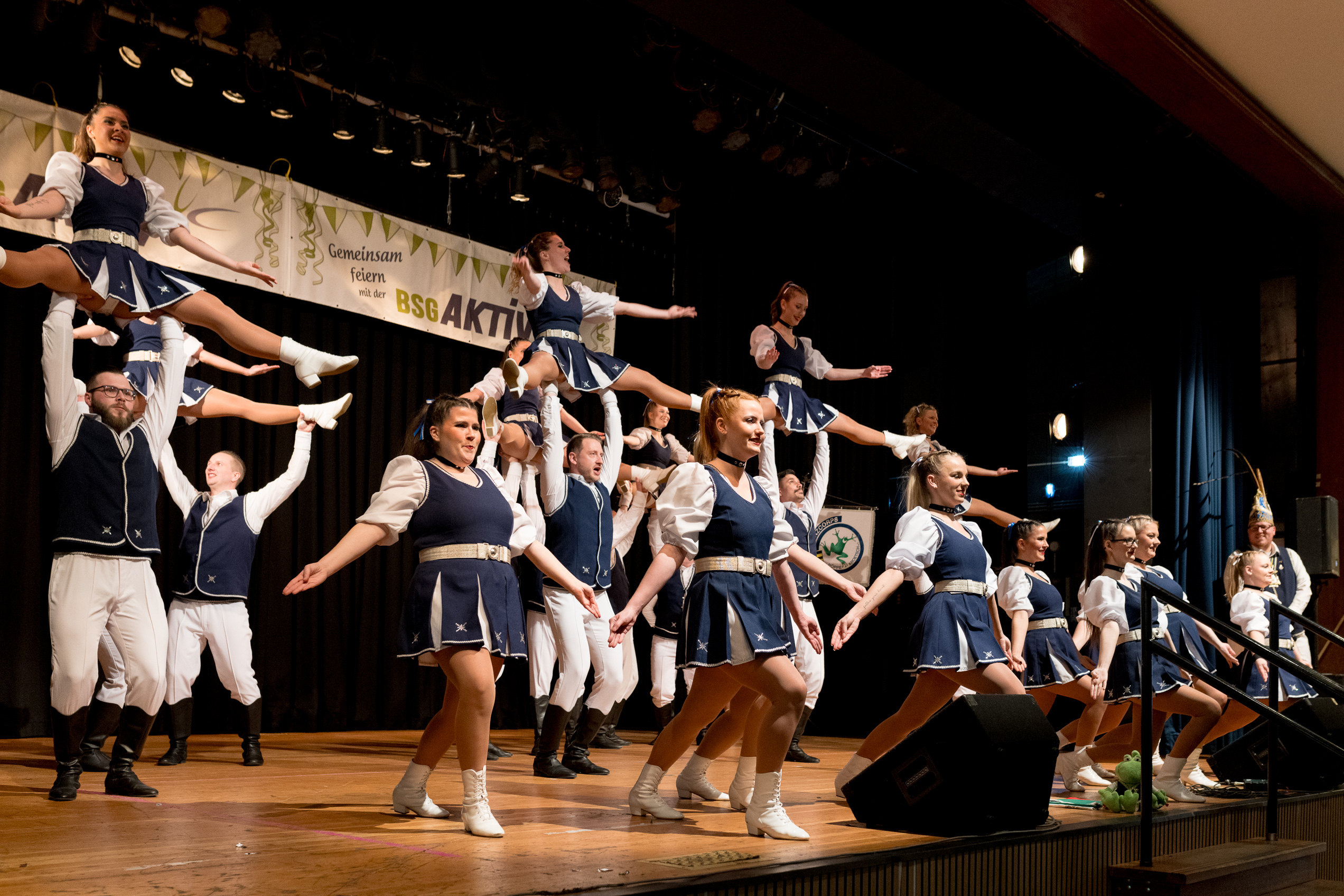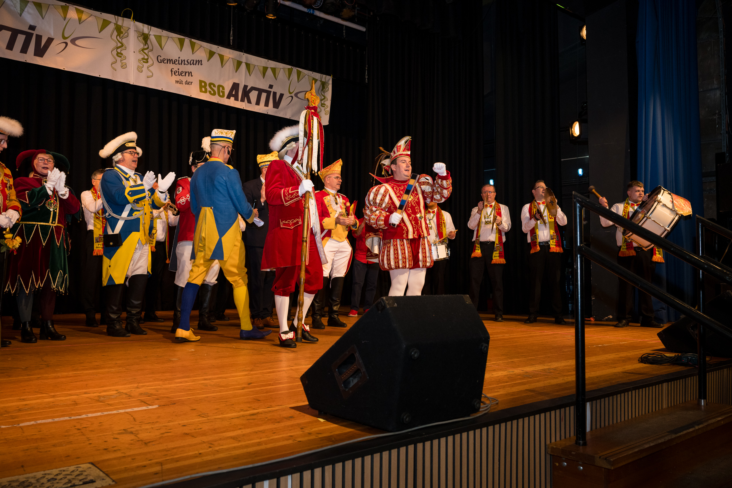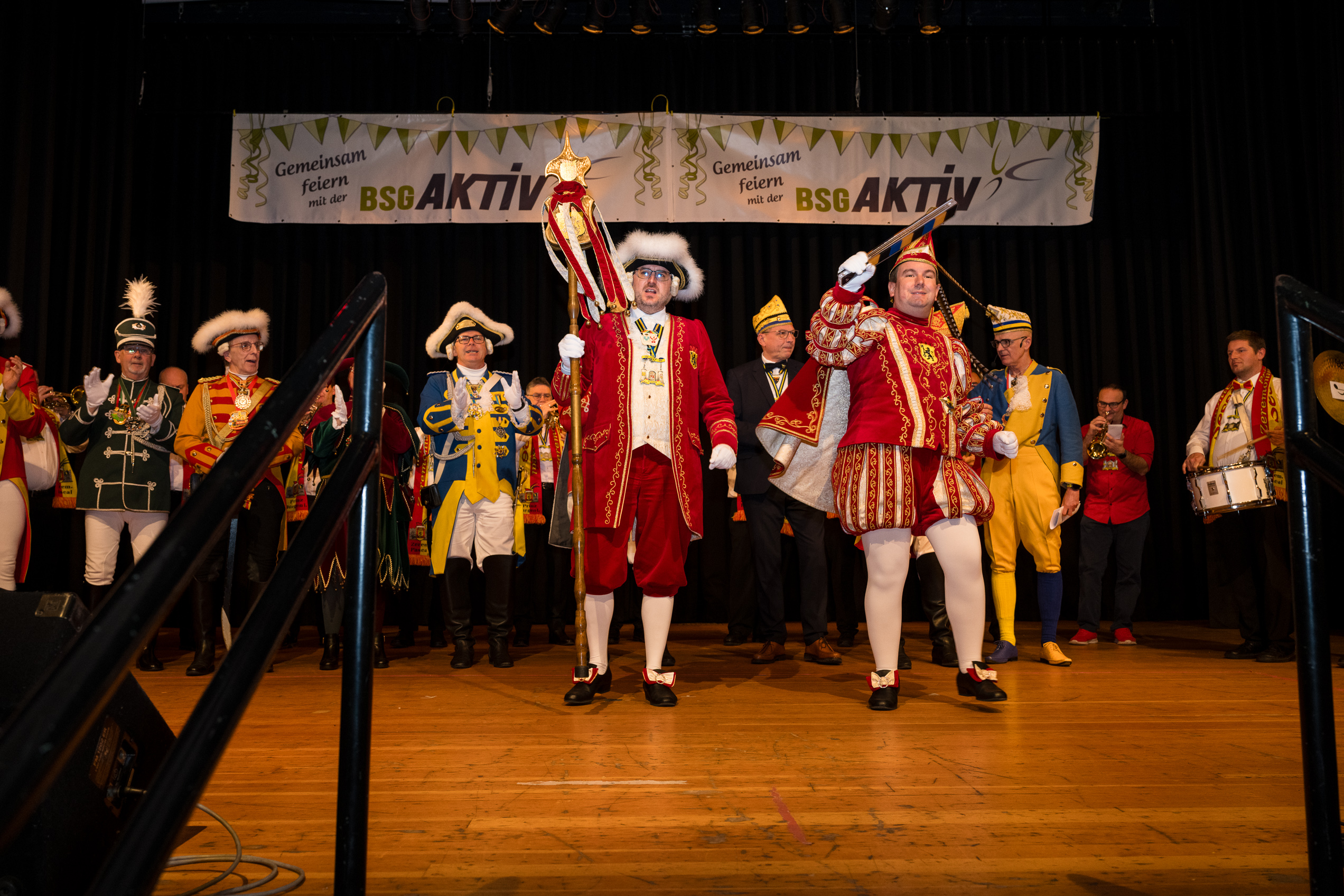 Auch 2026 war es wieder bewusst eine Wohnzimmersitzung mit rund 200 Gästen im großzügigen Saal der Festhalle Weisweiler – luftig und mit einem Publikum, das aufmerksam zuhört, aber auch mitgeht. Das Konzept ging erneut auf. Ein gut gelaunter und bestens über die auftretenden Künstler informierter Moderator führte durch das Programm, das traditionell aus Musik, Tanz und einer Büttenrede bestand. Eröffnet wurde das Programm von der Jugend des Garderegiments Weiß-Rot aus Eschweiler, angeführt von seiner souveränen Kinder-Präsidentin. Anschließend wurde es offiziell, Prinz Jürgen 1. Und sein Zeremonienmeister Pascal gaben sich mit Ihrem Gefolge die Ehre. Danach ging es weiter mit der Showtanzgruppe 4 step der Narrenzunft aus Eschweiler, die sich erst vor zwei Jahren gegründet hat, aber das Publikum mit der Darbietung und der Vielzahl der Tänzerinnen und Tänzer begeisterte. Als nächster Programmpunkt sorgten „Die Nothberger“ mit ihrem Entertrötment für phantastische Stimmung und holten das Publikum von den Stühlen. Etwas ruhiger ging es dann bei der Darbietung der Jugendtanzgruppe des TSC Gold Aachen weiter. Die Truppe, die mit ihrer Darbietung zurecht den Titel deutscher Vizemeister tragen darf, überzeugte mit einer einfühlsamen Darstellung.. Nach so viel hochklassigem Programm kam eine eingeplante Pause für mögliche Verzögerungen gerade recht. Durchatmen, die Kollegen und Bekannten am Nachbartisch begrüßen oder sich im Foyer stärken waren dann auch die hauptsächlichen Beschäftigungen der Gäste. Viel Zeit blieb jedoch nicht, der in Eschweiler noch nicht aufgetretene Büttenredner Björn Wassong alias „Ne Jeck im Rähn“ hatte das Publikum schnell wieder auf Betriebstemperatur und wurde mit Standing Ovations verabschiedet. Das TanzCorps Colonia Rut Wiess war bereits 2025 einer der Höhepunkte der BSG-Sitzung und konnte 2026 nahtlos an die grandiose Leistung anknüpfen. Akrobatik auf höchstem Niveau wurde vom Publikum mit langanhaltendem Applaus belohnt und wir sind sicher, dass diese Truppe nicht zum letzten Mal bei der BSG zu Gast war. Nach einer solchen Truppe aufzutreten ist nicht einfach, aber die Gesangstruppe „Bremsklötz“ aus Inden-Altdorf meisterte diese Herausforderung souverän. Die drei Herren sangen sich im und mit dem Publikum quer durch die bekanntesten Karnevalslieder der letzten Jahrzehnte und kamen ebenfalls nicht ohne Zugabe von der Bühne. Nach den Bremsklötz zog die Ehrengarde Köln 1902 e.V. auf und zeigte, dass man eine eigene Veranstaltung in Köln und einen zahlenmäßig großen Auftritt in Weisweiler durchaus parallel bestreiten kann. Die Referenz ans Publikum sowie die musikalischen und tänzerischen Darbietungen begeisterten das Publikum. Den Schlussakkord setzte dann wiederum das Tanzcorps Höppe Kroetsch, in deren Wohnzimmer die Sitzung stattfand. Mit gleich drei Tänzen begeisterte das Tanzcorps das Publikum und hielt die Stimmung bis zum Schluss hoch. Zum Ausmarsch wurde der Moderator noch zum Standartenträger gemacht und konnte somit standesgemäß die Bühne in Begleitung verlassen.