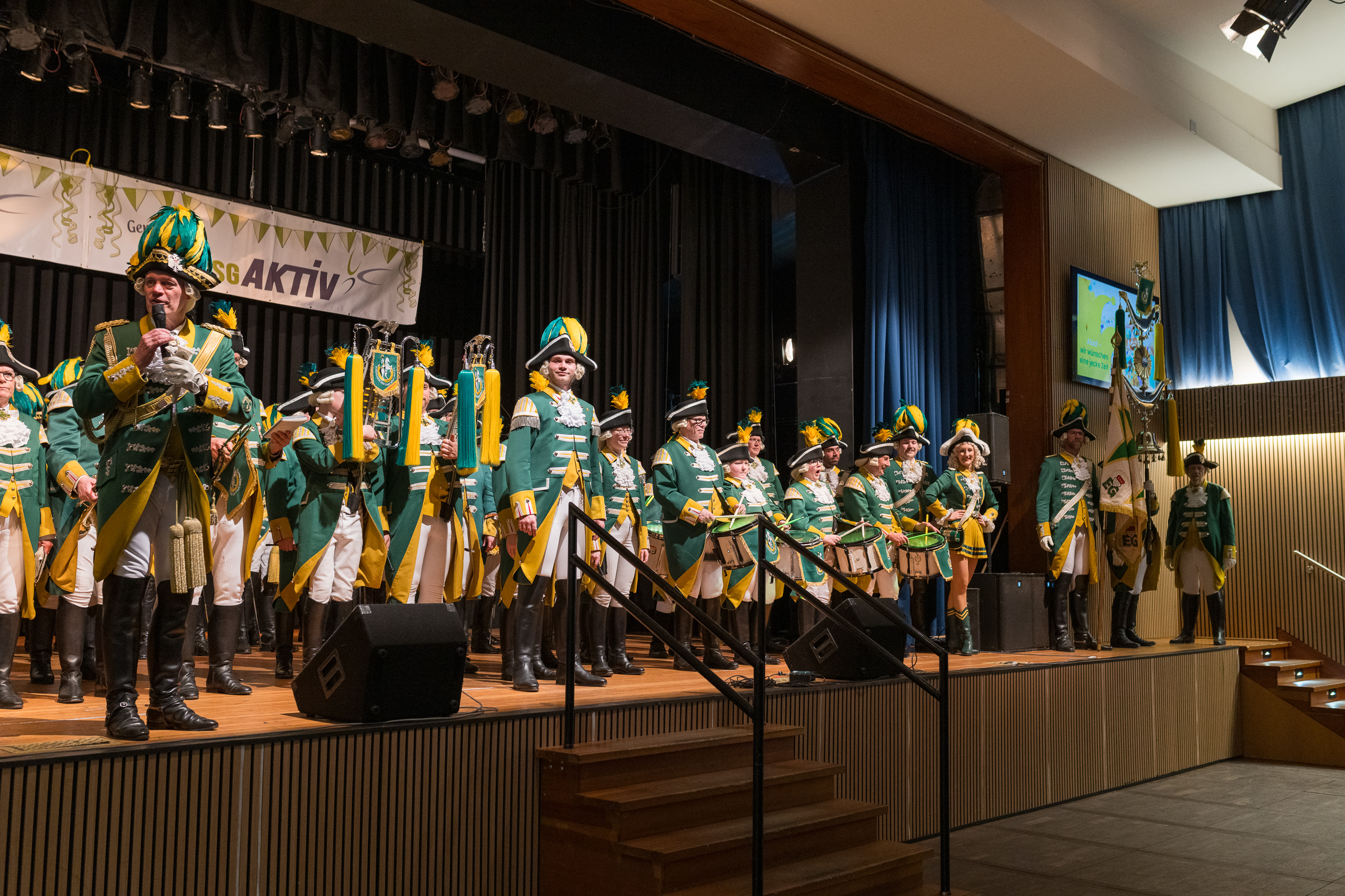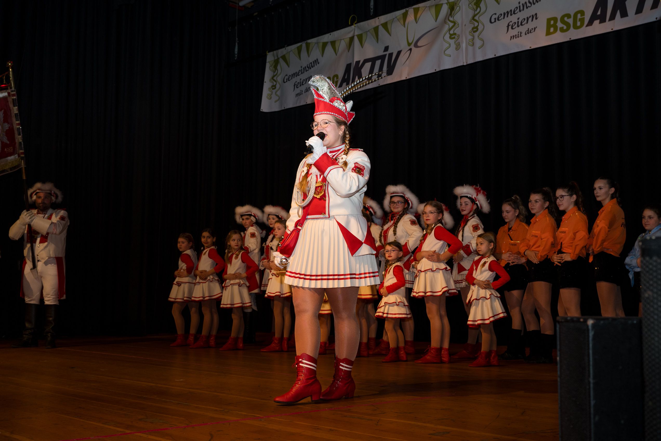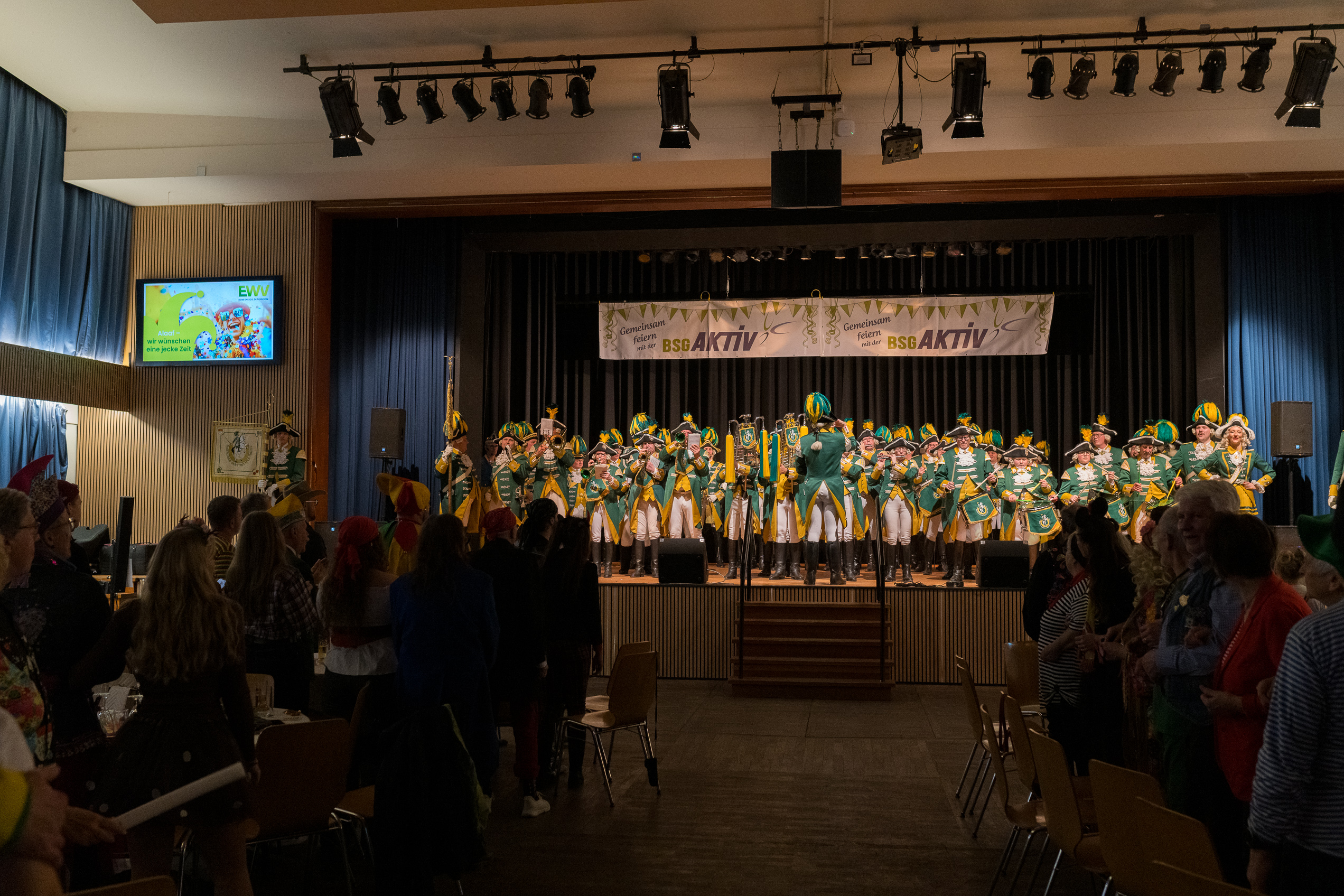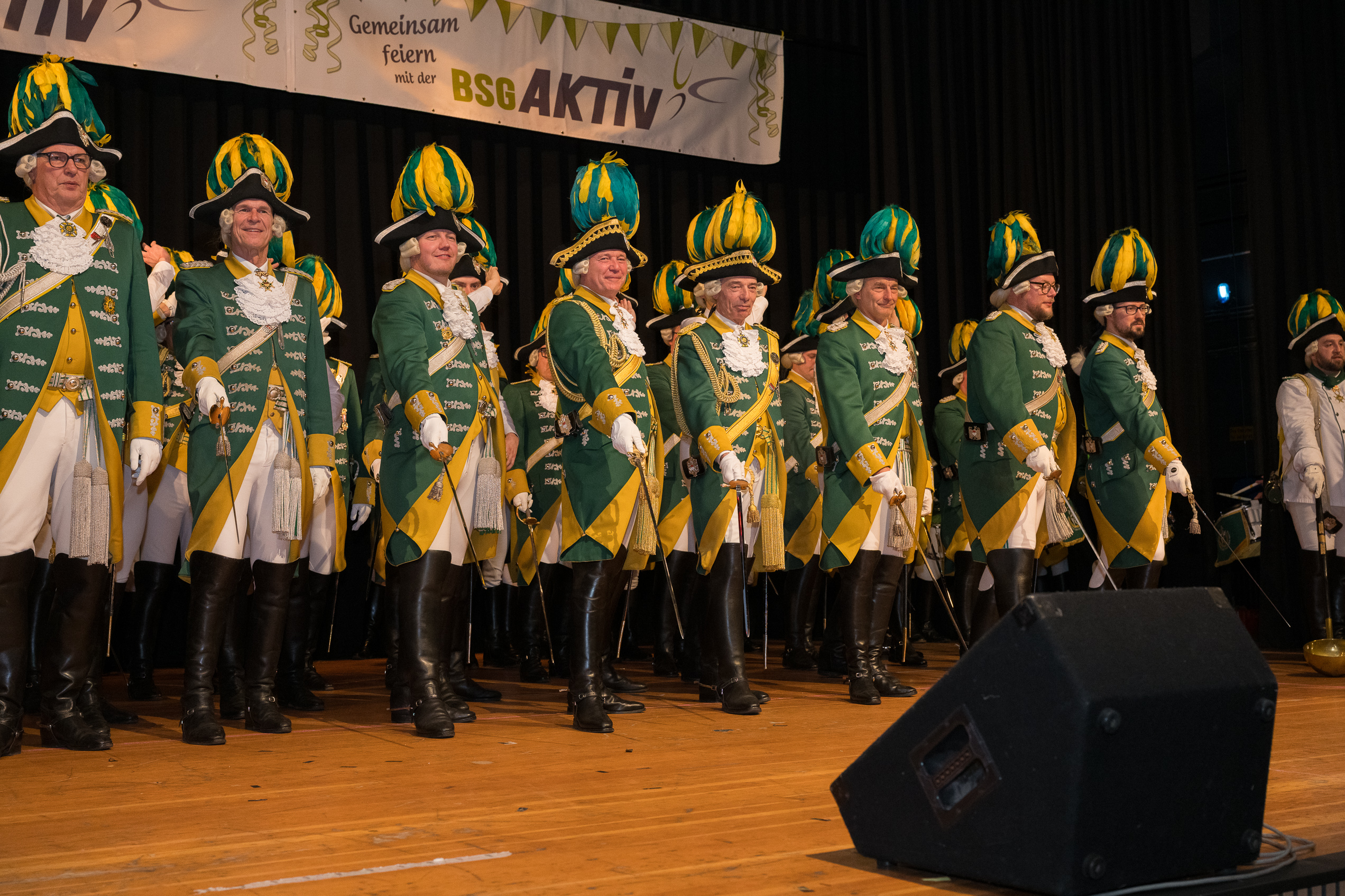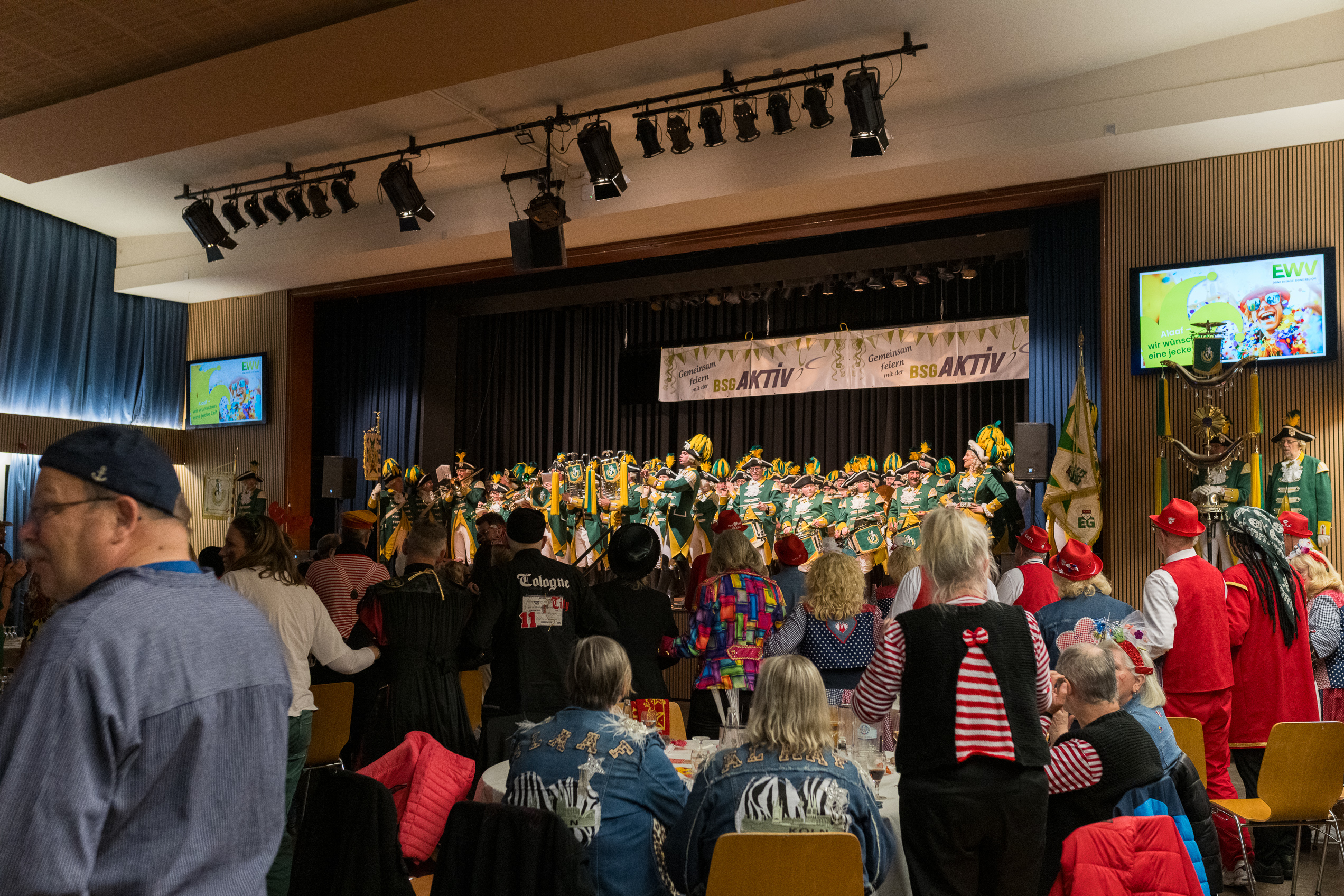Auch 2026 war es wieder bewusst eine Wohnzimmersitzung mit rund 200 Gästen im großzügigen Saal der Festhalle Weisweiler – luftig und mit einem Publikum, das aufmerksam zuhört, aber auch mitgeht. Das Konzept ging erneut auf. Ein gut gelaunter und bestens über die auftretenden Künstler informierter Moderator führte durch das Programm, das traditionell aus Musik, Tanz und einer Büttenrede bestand. Eröffnet wurde das Programm von der Jugend des Garderegiments Weiß-Rot aus Eschweiler, angeführt von seiner souveränen Kinder-Präsidentin. Anschließend wurde es offiziell, Prinz Jürgen 1. Und sein Zeremonienmeister Pascal gaben sich mit Ihrem Gefolge die Ehre. Danach ging es weiter mit der Showtanzgruppe 4 step der Narrenzunft aus Eschweiler, die sich erst vor zwei Jahren gegründet hat, aber das Publikum mit der Darbietung und der Vielzahl der Tänzerinnen und Tänzer begeisterte. Als nächster Programmpunkt sorgten „Die Nothberger“ mit ihrem Entertrötment für phantastische Stimmung und holten das Publikum von den Stühlen. Etwas ruhiger ging es dann bei der Darbietung der Jugendtanzgruppe des TSC Gold Aachen weiter. Die Truppe, die mit ihrer Darbietung zurecht den Titel deutscher Vizemeister tragen darf, überzeugte mit einer einfühlsamen Darstellung.. Nach so viel hochklassigem Programm kam eine eingeplante Pause für mögliche Verzögerungen gerade recht. Durchatmen, die Kollegen und Bekannten am Nachbartisch begrüßen oder sich im Foyer stärken waren dann auch die hauptsächlichen Beschäftigungen der Gäste. Viel Zeit blieb jedoch nicht, der in Eschweiler noch nicht aufgetretene Büttenredner Björn Wassong alias „Ne Jeck im Rähn“ hatte das Publikum schnell wieder auf Betriebstemperatur und wurde mit Standing Ovations verabschiedet. Das TanzCorps Colonia Rut Wiess war bereits 2025 einer der Höhepunkte der BSG-Sitzung und konnte 2026 nahtlos an die grandiose Leistung anknüpfen. Akrobatik auf höchstem Niveau wurde vom Publikum mit langanhaltendem Applaus belohnt und wir sind sicher, dass diese Truppe nicht zum letzten Mal bei der BSG zu Gast war. Nach einer solchen Truppe aufzutreten ist nicht einfach, aber die Gesangstruppe „Bremsklötz“ aus Inden-Altdorf meisterte diese Herausforderung souverän. Die drei Herren sangen sich im und mit dem Publikum quer durch die bekanntesten Karnevalslieder der letzten Jahrzehnte und kamen ebenfalls nicht ohne Zugabe von der Bühne. Nach den Bremsklötz zog die Ehrengarde Köln 1902 e.V. auf und zeigte, dass man eine eigene Veranstaltung in Köln und einen zahlenmäßig großen Auftritt in Weisweiler durchaus parallel bestreiten kann. Die Referenz ans Publikum sowie die musikalischen und tänzerischen Darbietungen begeisterten das Publikum. Den Schlussakkord setzte dann wiederum das Tanzcorps Höppe Kroetsch, in deren Wohnzimmer die Sitzung stattfand. Mit gleich drei Tänzen begeisterte das Tanzcorps das Publikum und hielt die Stimmung bis zum Schluss hoch. Zum Ausmarsch wurde der Moderator noch zum Standartenträger gemacht und konnte somit standesgemäß die Bühne in Begleitung verlassen.