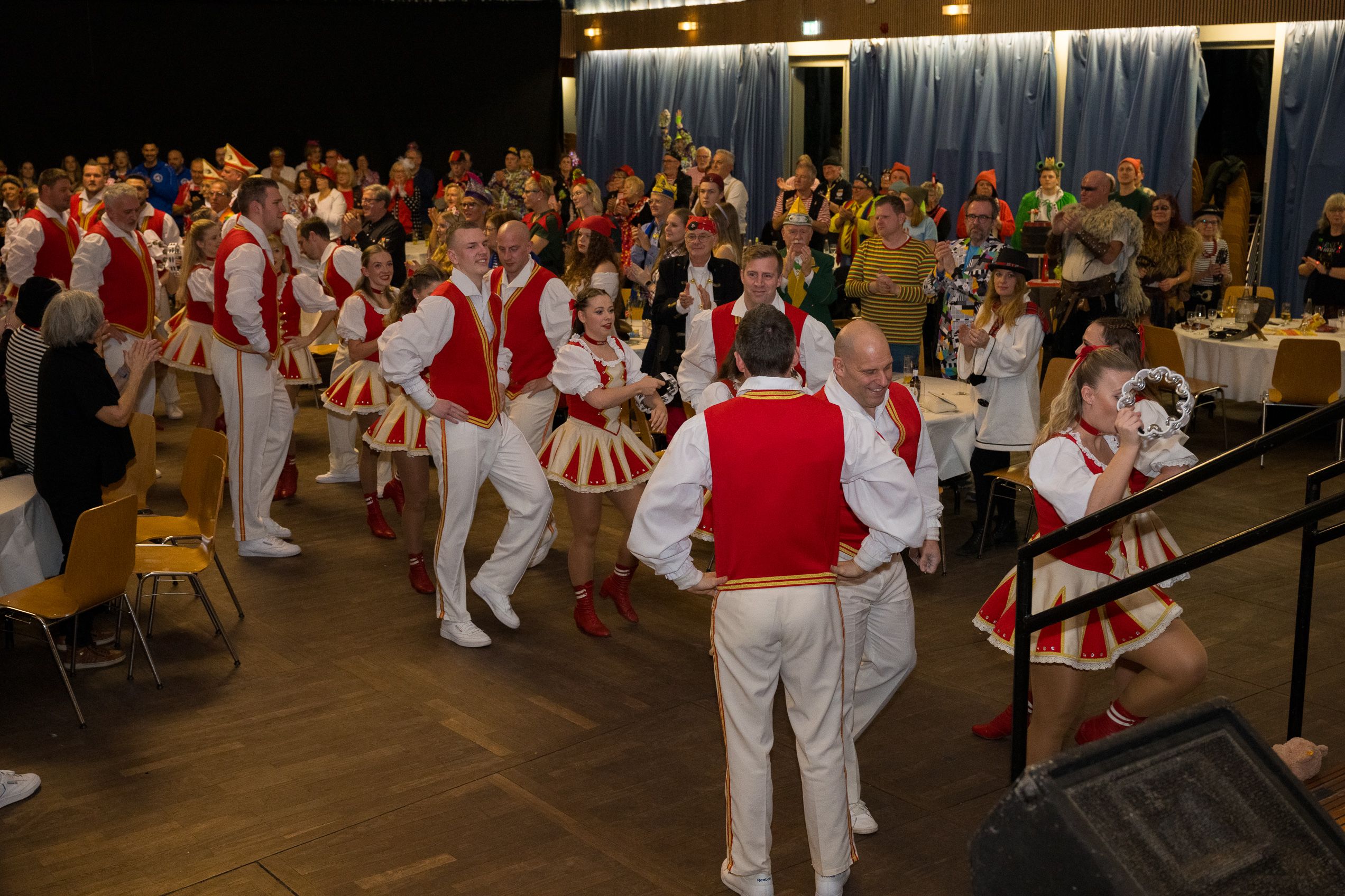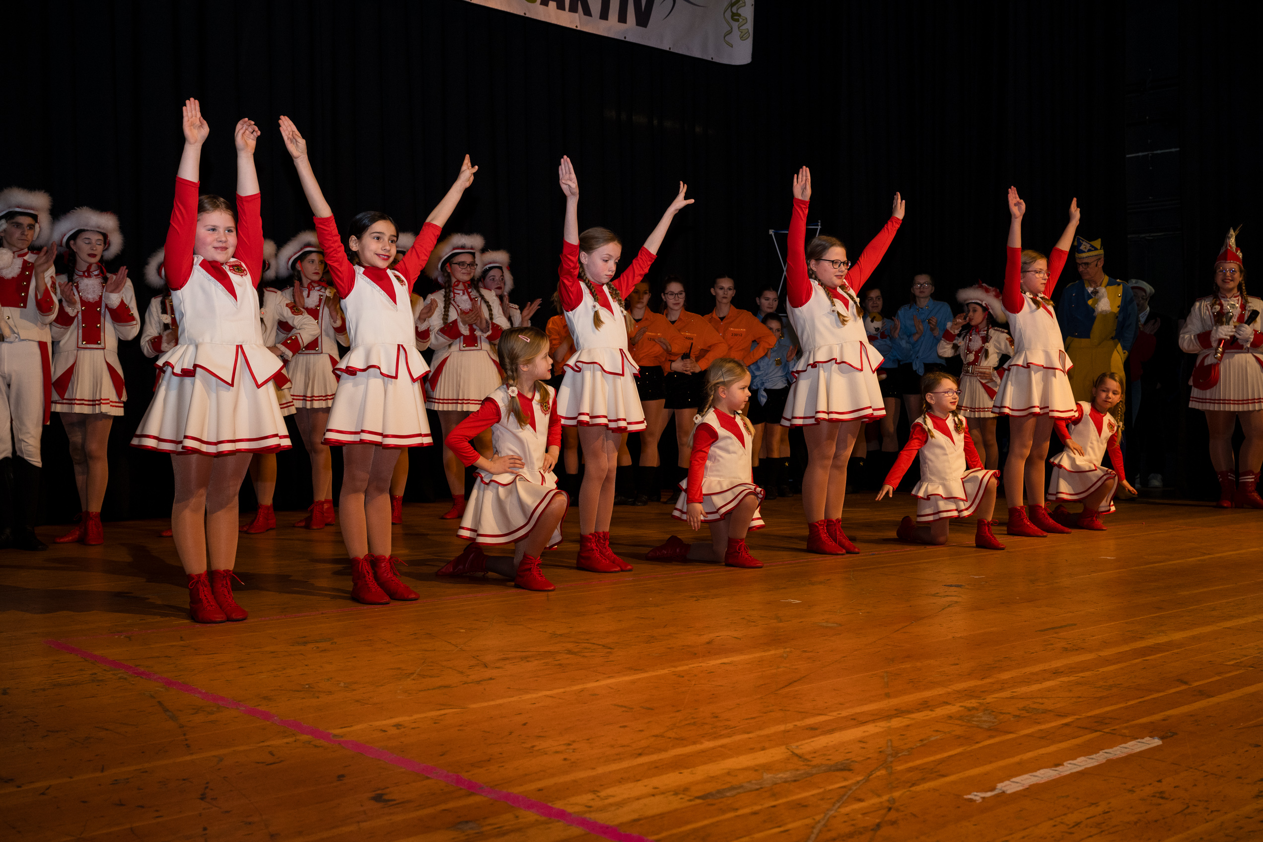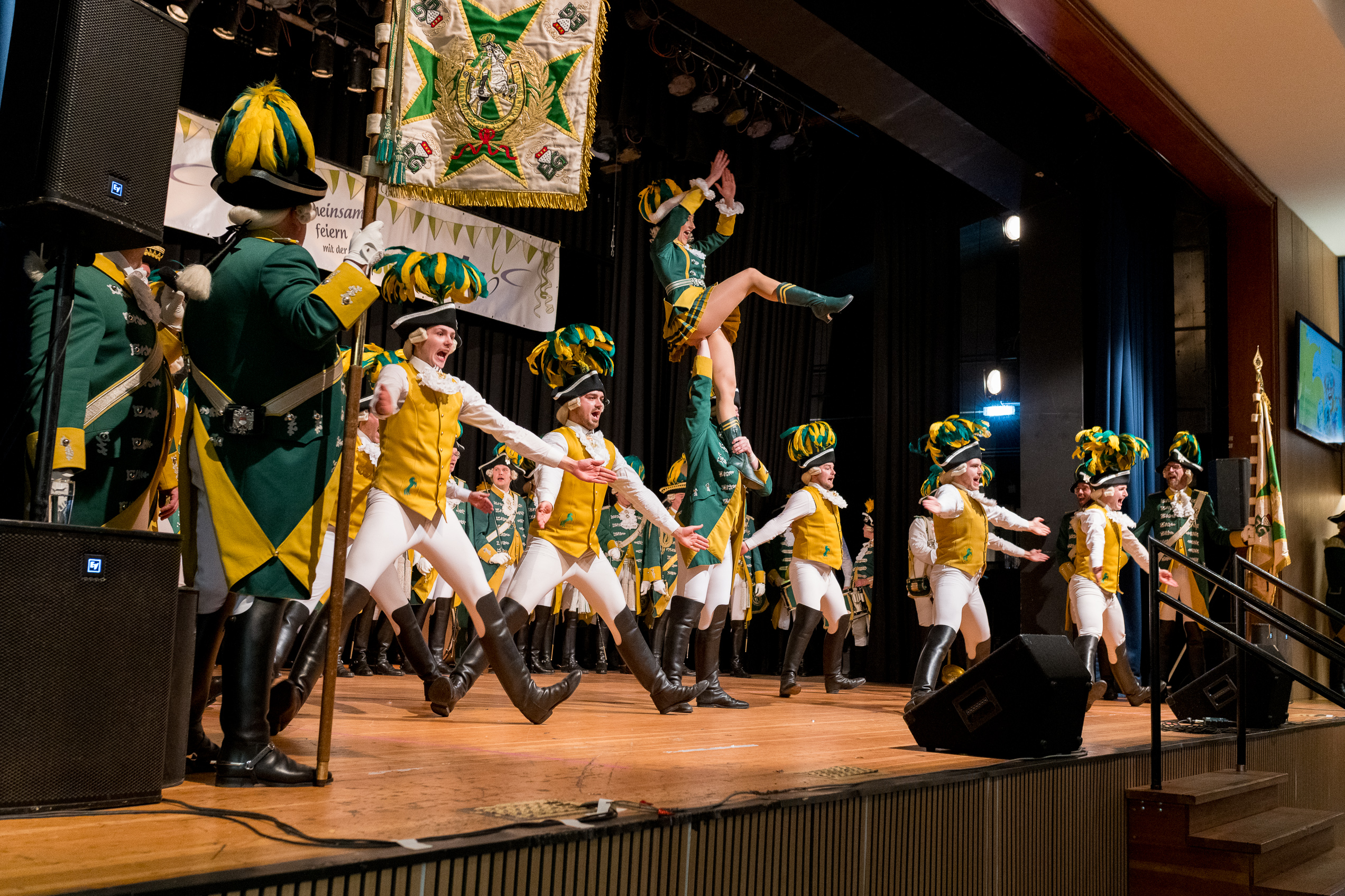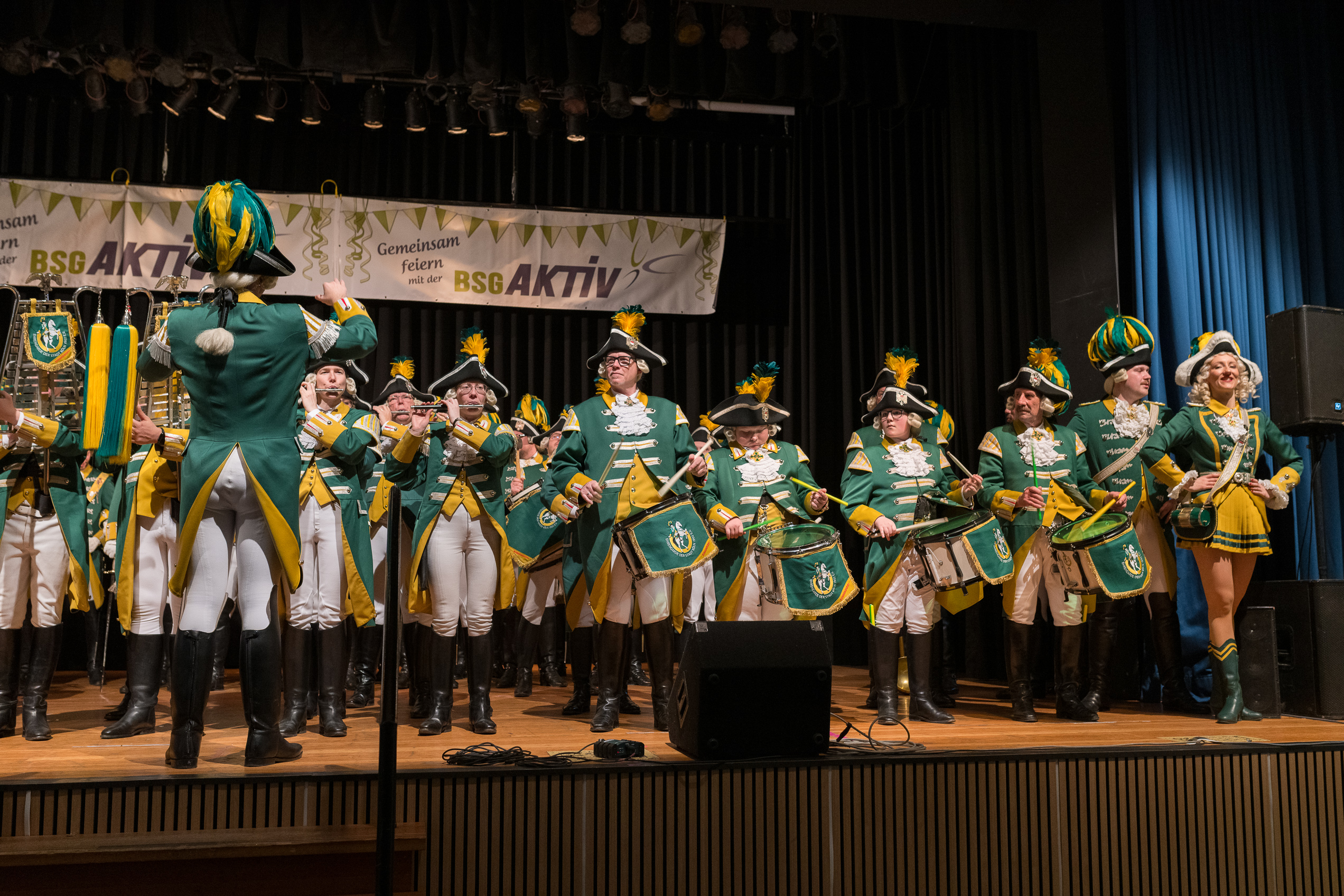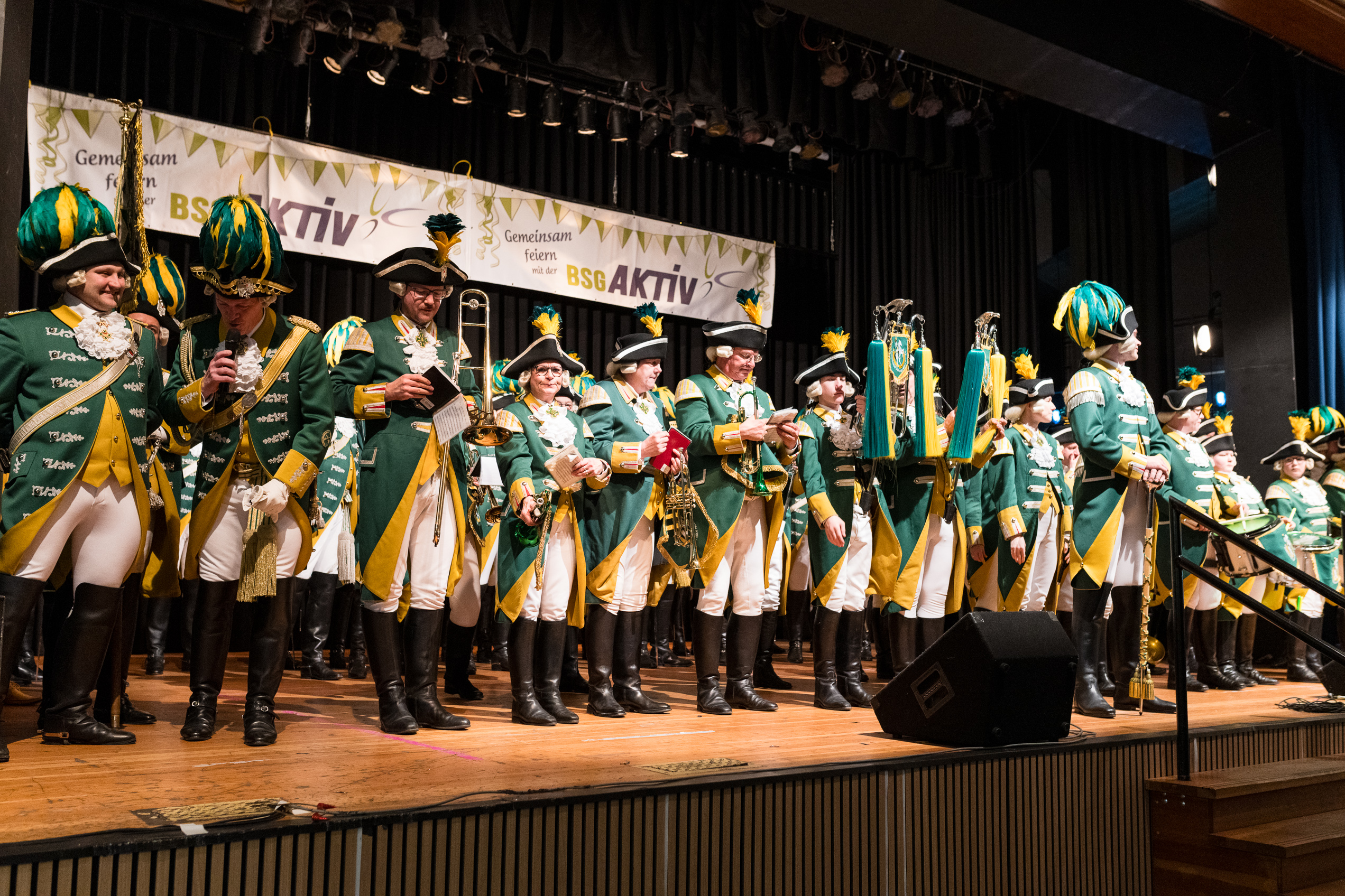 Auch 2026 war es wieder bewusst eine Wohnzimmersitzung mit rund 200 Gästen im großzügigen Saal der Festhalle Weisweiler – luftig und mit einem Publikum, das aufmerksam zuhört, aber auch mitgeht. Das Konzept ging erneut auf. Ein gut gelaunter und bestens über die auftretenden Künstler informierter Moderator führte durch das Programm, das traditionell aus Musik, Tanz und einer Büttenrede bestand. Eröffnet wurde das Programm von der Jugend des Garderegiments Weiß-Rot aus Eschweiler, angeführt von seiner souveränen Kinder-Präsidentin. Anschließend wurde es offiziell, Prinz Jürgen 1. Und sein Zeremonienmeister Pascal gaben sich mit Ihrem Gefolge die Ehre. Danach ging es weiter mit der Showtanzgruppe 4 step der Narrenzunft aus Eschweiler, die sich erst vor zwei Jahren gegründet hat, aber das Publikum mit der Darbietung und der Vielzahl der Tänzerinnen und Tänzer begeisterte. Als nächster Programmpunkt sorgten „Die Nothberger“ mit ihrem Entertrötment für phantastische Stimmung und holten das Publikum von den Stühlen. Etwas ruhiger ging es dann bei der Darbietung der Jugendtanzgruppe des TSC Gold Aachen weiter. Die Truppe, die mit ihrer Darbietung zurecht den Titel deutscher Vizemeister tragen darf, überzeugte mit einer einfühlsamen Darstellung.. Nach so viel hochklassigem Programm kam eine eingeplante Pause für mögliche Verzögerungen gerade recht. Durchatmen, die Kollegen und Bekannten am Nachbartisch begrüßen oder sich im Foyer stärken waren dann auch die hauptsächlichen Beschäftigungen der Gäste. Viel Zeit blieb jedoch nicht, der in Eschweiler noch nicht aufgetretene Büttenredner Björn Wassong alias „Ne Jeck im Rähn“ hatte das Publikum schnell wieder auf Betriebstemperatur und wurde mit Standing Ovations verabschiedet. Das TanzCorps Colonia Rut Wiess war bereits 2025 einer der Höhepunkte der BSG-Sitzung und konnte 2026 nahtlos an die grandiose Leistung anknüpfen. Akrobatik auf höchstem Niveau wurde vom Publikum mit langanhaltendem Applaus belohnt und wir sind sicher, dass diese Truppe nicht zum letzten Mal bei der BSG zu Gast war. Nach einer solchen Truppe aufzutreten ist nicht einfach, aber die Gesangstruppe „Bremsklötz“ aus Inden-Altdorf meisterte diese Herausforderung souverän. Die drei Herren sangen sich im und mit dem Publikum quer durch die bekanntesten Karnevalslieder der letzten Jahrzehnte und kamen ebenfalls nicht ohne Zugabe von der Bühne. Nach den Bremsklötz zog die Ehrengarde Köln 1902 e.V. auf und zeigte, dass man eine eigene Veranstaltung in Köln und einen zahlenmäßig großen Auftritt in Weisweiler durchaus parallel bestreiten kann. Die Referenz ans Publikum sowie die musikalischen und tänzerischen Darbietungen begeisterten das Publikum. Den Schlussakkord setzte dann wiederum das Tanzcorps Höppe Kroetsch, in deren Wohnzimmer die Sitzung stattfand. Mit gleich drei Tänzen begeisterte das Tanzcorps das Publikum und hielt die Stimmung bis zum Schluss hoch. Zum Ausmarsch wurde der Moderator noch zum Standartenträger gemacht und konnte somit standesgemäß die Bühne in Begleitung verlassen.