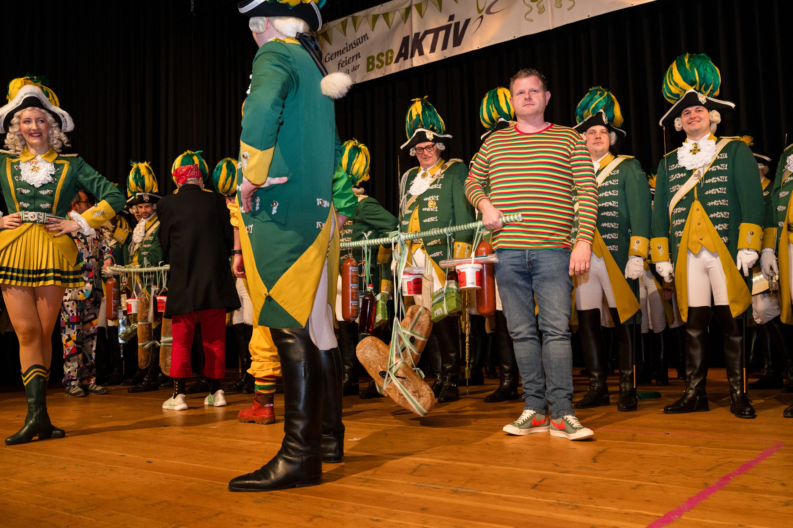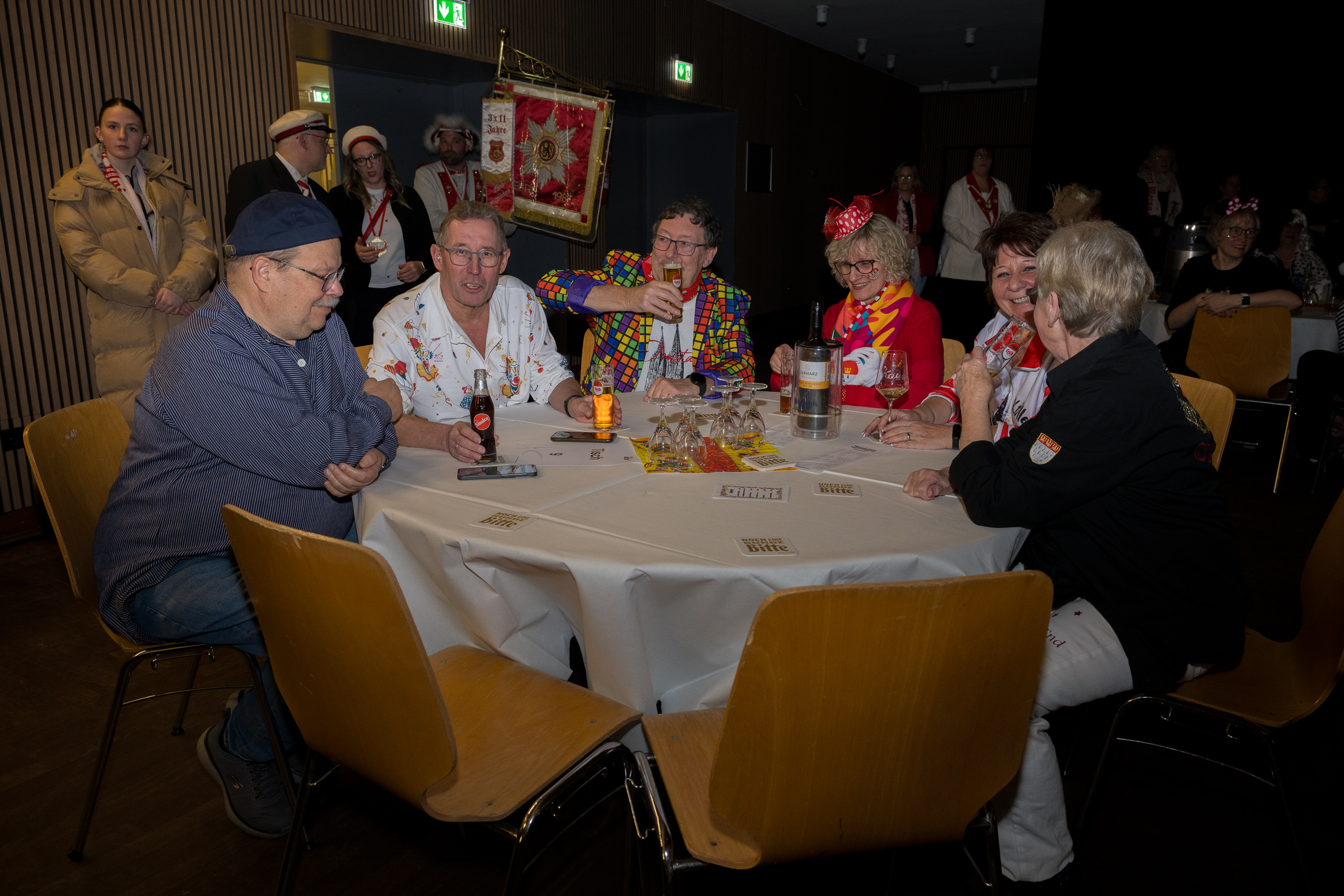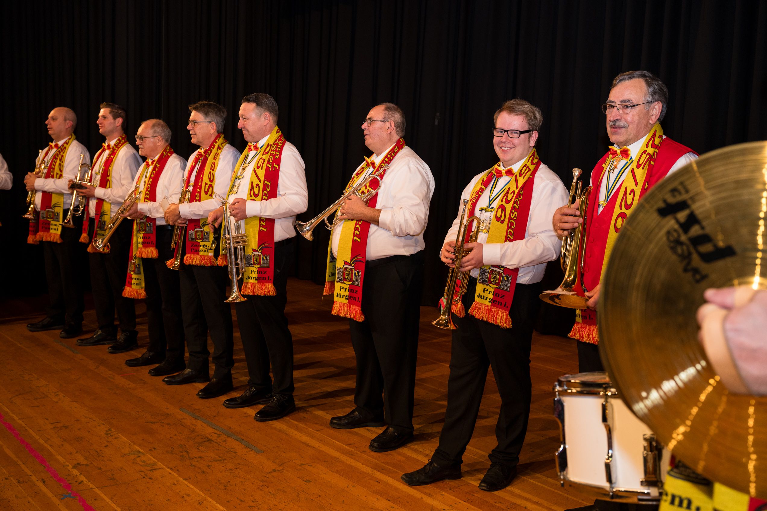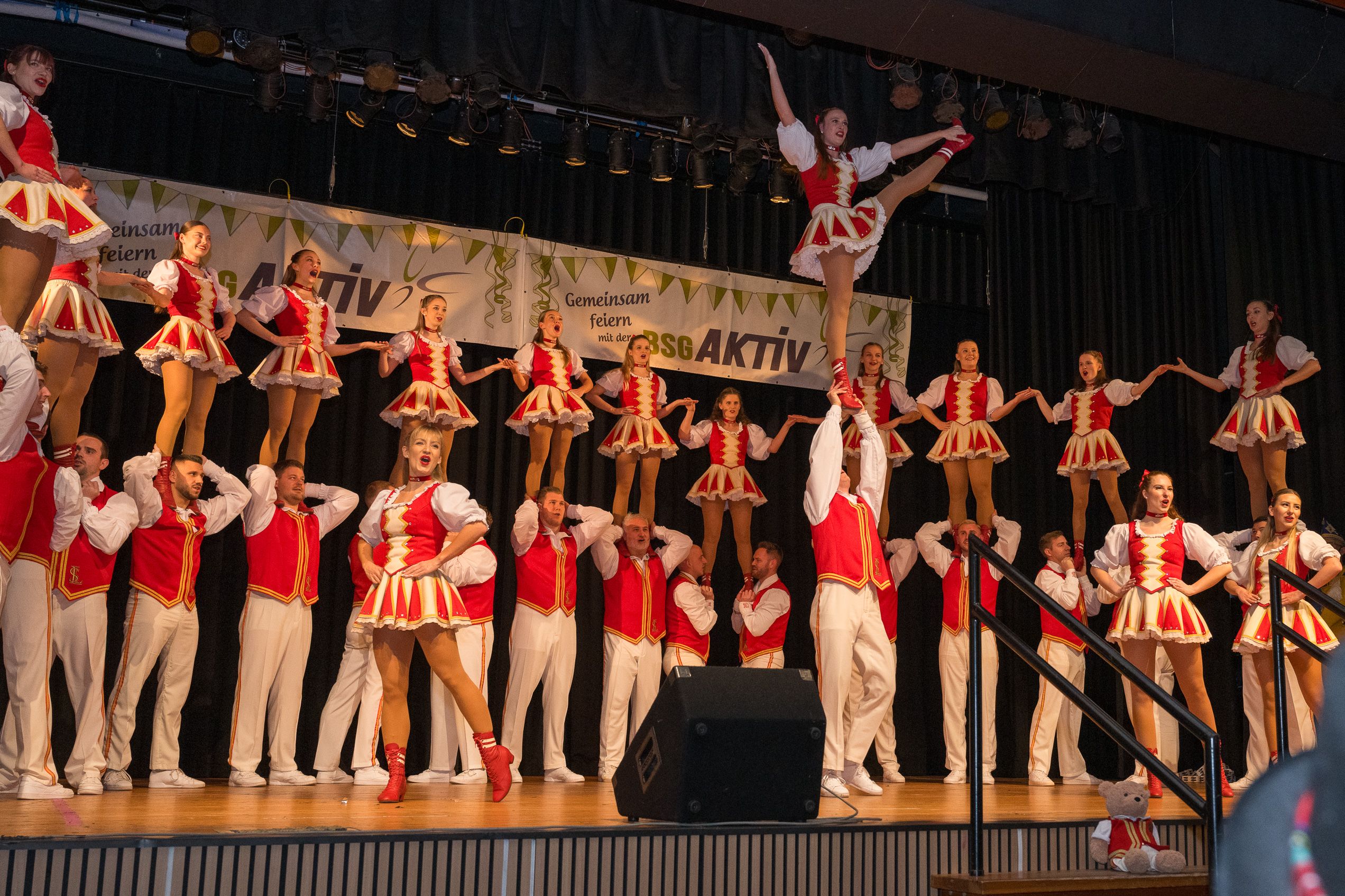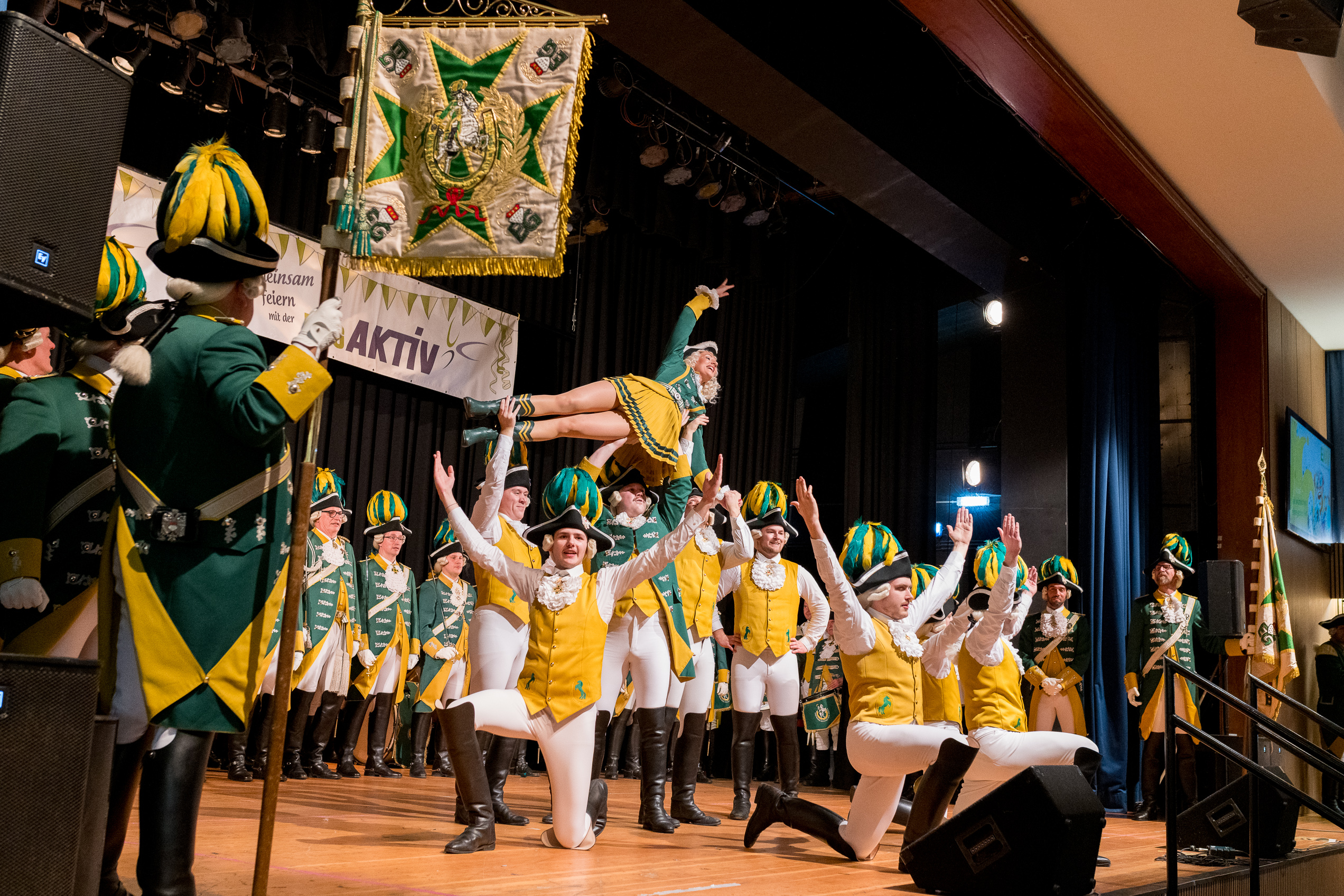 Auch 2026 war es wieder bewusst eine Wohnzimmersitzung mit rund 200 Gästen im großzügigen Saal der Festhalle Weisweiler – luftig und mit einem Publikum, das aufmerksam zuhört, aber auch mitgeht. Das Konzept ging erneut auf. Ein gut gelaunter und bestens über die auftretenden Künstler informierter Moderator führte durch das Programm, das traditionell aus Musik, Tanz und einer Büttenrede bestand. Eröffnet wurde das Programm von der Jugend des Garderegiments Weiß-Rot aus Eschweiler, angeführt von seiner souveränen Kinder-Präsidentin. Anschließend wurde es offiziell, Prinz Jürgen 1. Und sein Zeremonienmeister Pascal gaben sich mit Ihrem Gefolge die Ehre. Danach ging es weiter mit der Showtanzgruppe 4 step der Narrenzunft aus Eschweiler, die sich erst vor zwei Jahren gegründet hat, aber das Publikum mit der Darbietung und der Vielzahl der Tänzerinnen und Tänzer begeisterte. Als nächster Programmpunkt sorgten „Die Nothberger“ mit ihrem Entertrötment für phantastische Stimmung und holten das Publikum von den Stühlen. Etwas ruhiger ging es dann bei der Darbietung der Jugendtanzgruppe des TSC Gold Aachen weiter. Die Truppe, die mit ihrer Darbietung zurecht den Titel deutscher Vizemeister tragen darf, überzeugte mit einer einfühlsamen Darstellung.. Nach so viel hochklassigem Programm kam eine eingeplante Pause für mögliche Verzögerungen gerade recht. Durchatmen, die Kollegen und Bekannten am Nachbartisch begrüßen oder sich im Foyer stärken waren dann auch die hauptsächlichen Beschäftigungen der Gäste. Viel Zeit blieb jedoch nicht, der in Eschweiler noch nicht aufgetretene Büttenredner Björn Wassong alias „Ne Jeck im Rähn“ hatte das Publikum schnell wieder auf Betriebstemperatur und wurde mit Standing Ovations verabschiedet. Das TanzCorps Colonia Rut Wiess war bereits 2025 einer der Höhepunkte der BSG-Sitzung und konnte 2026 nahtlos an die grandiose Leistung anknüpfen. Akrobatik auf höchstem Niveau wurde vom Publikum mit langanhaltendem Applaus belohnt und wir sind sicher, dass diese Truppe nicht zum letzten Mal bei der BSG zu Gast war. Nach einer solchen Truppe aufzutreten ist nicht einfach, aber die Gesangstruppe „Bremsklötz“ aus Inden-Altdorf meisterte diese Herausforderung souverän. Die drei Herren sangen sich im und mit dem Publikum quer durch die bekanntesten Karnevalslieder der letzten Jahrzehnte und kamen ebenfalls nicht ohne Zugabe von der Bühne. Nach den Bremsklötz zog die Ehrengarde Köln 1902 e.V. auf und zeigte, dass man eine eigene Veranstaltung in Köln und einen zahlenmäßig großen Auftritt in Weisweiler durchaus parallel bestreiten kann. Die Referenz ans Publikum sowie die musikalischen und tänzerischen Darbietungen begeisterten das Publikum. Den Schlussakkord setzte dann wiederum das Tanzcorps Höppe Kroetsch, in deren Wohnzimmer die Sitzung stattfand. Mit gleich drei Tänzen begeisterte das Tanzcorps das Publikum und hielt die Stimmung bis zum Schluss hoch. Zum Ausmarsch wurde der Moderator noch zum Standartenträger gemacht und konnte somit standesgemäß die Bühne in Begleitung verlassen.