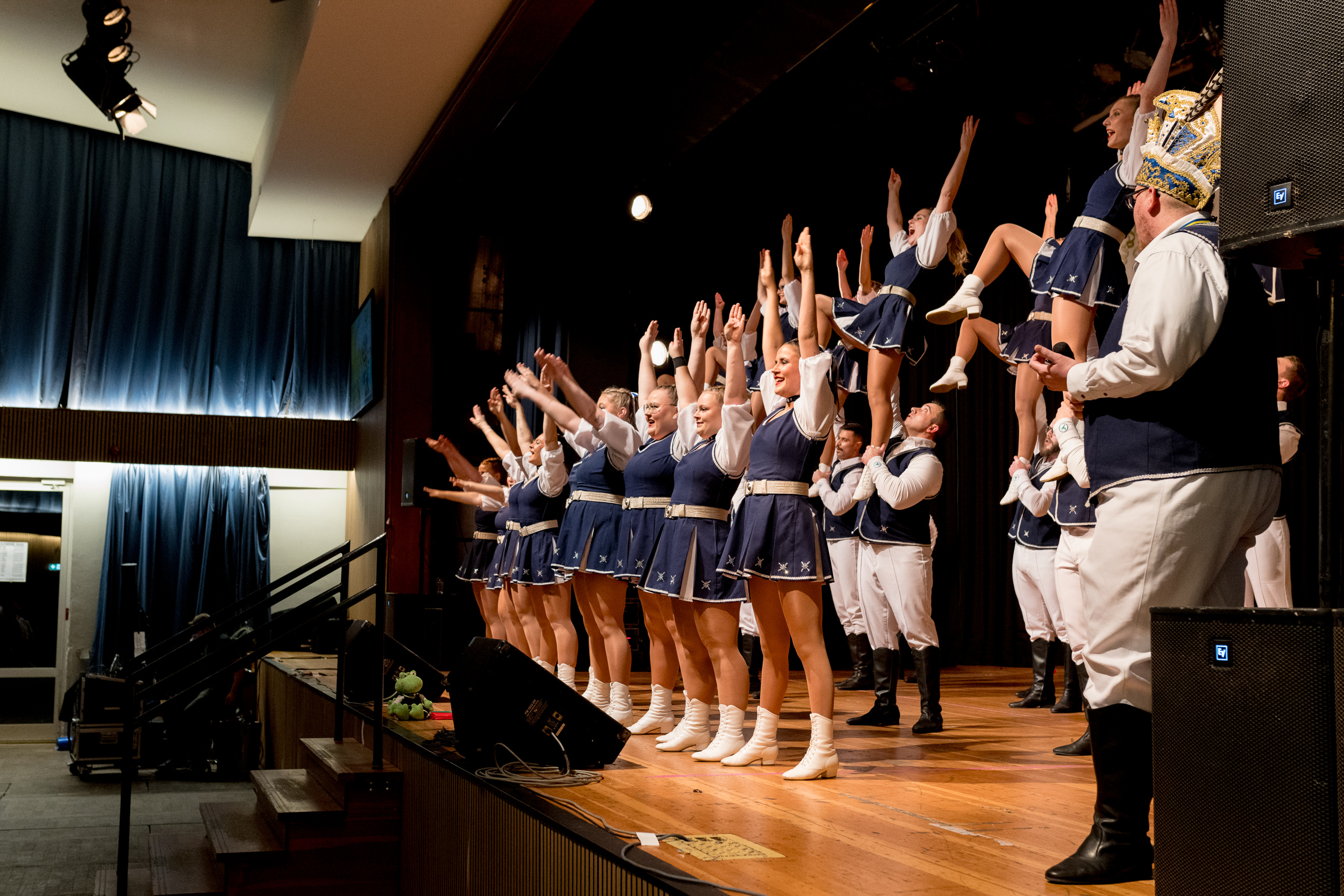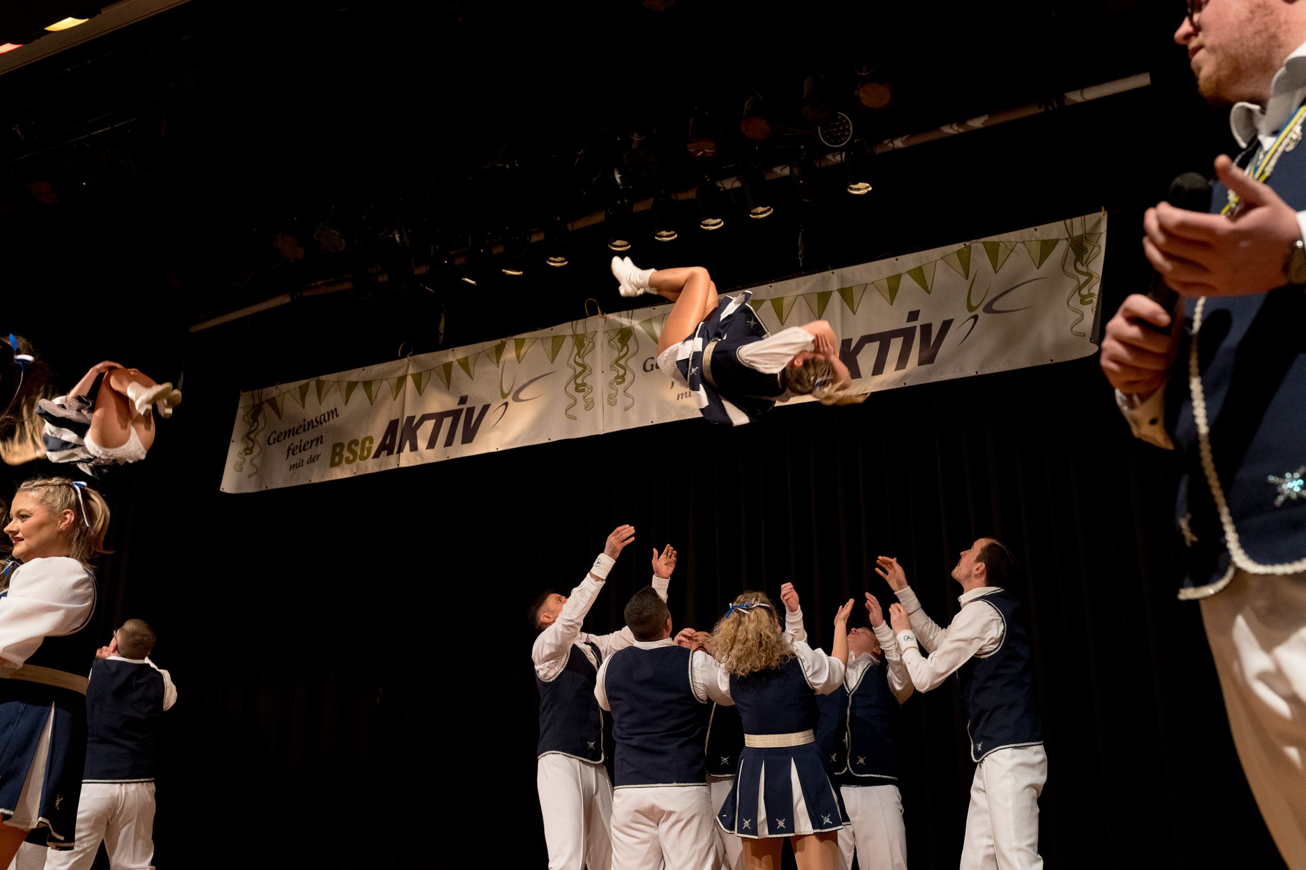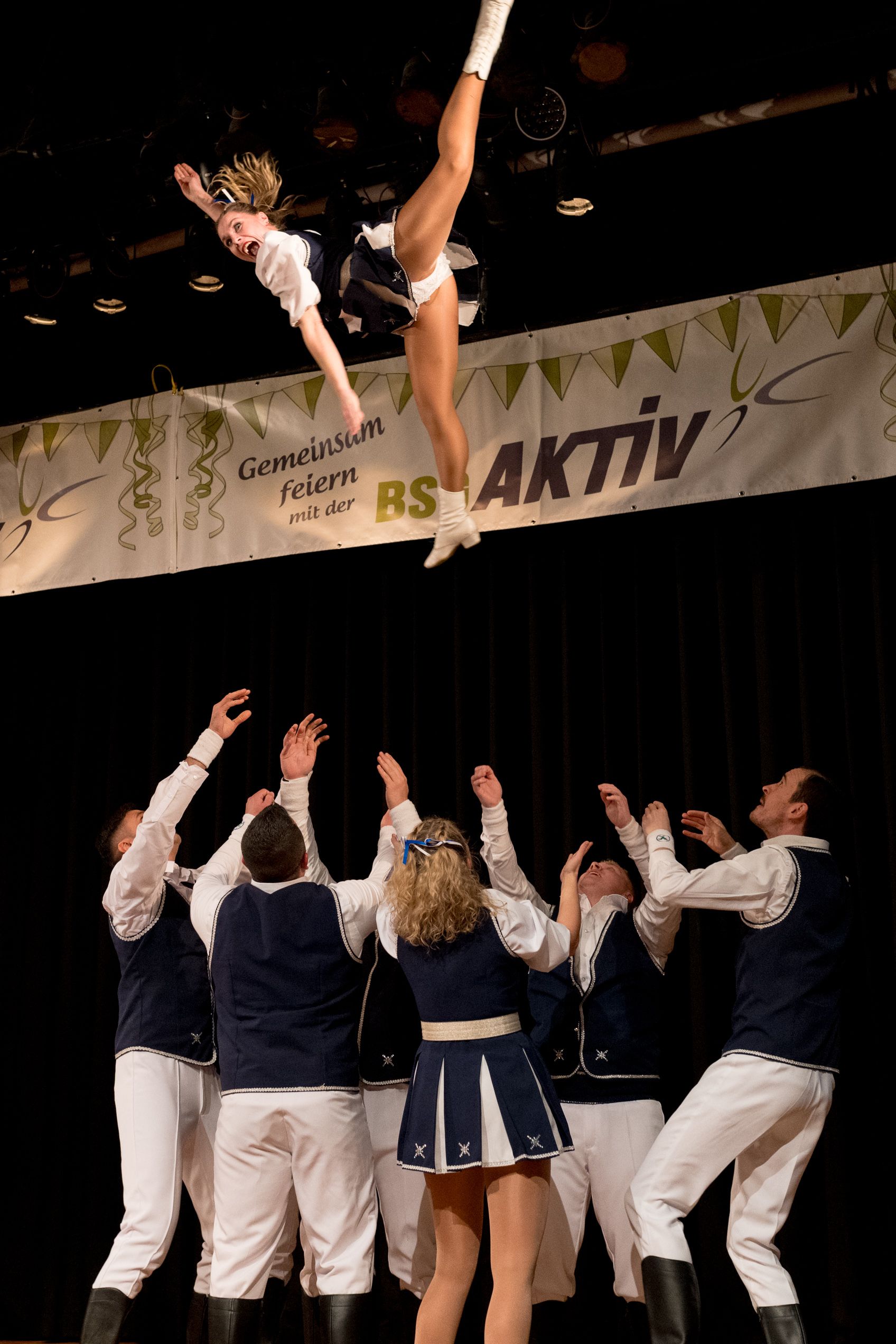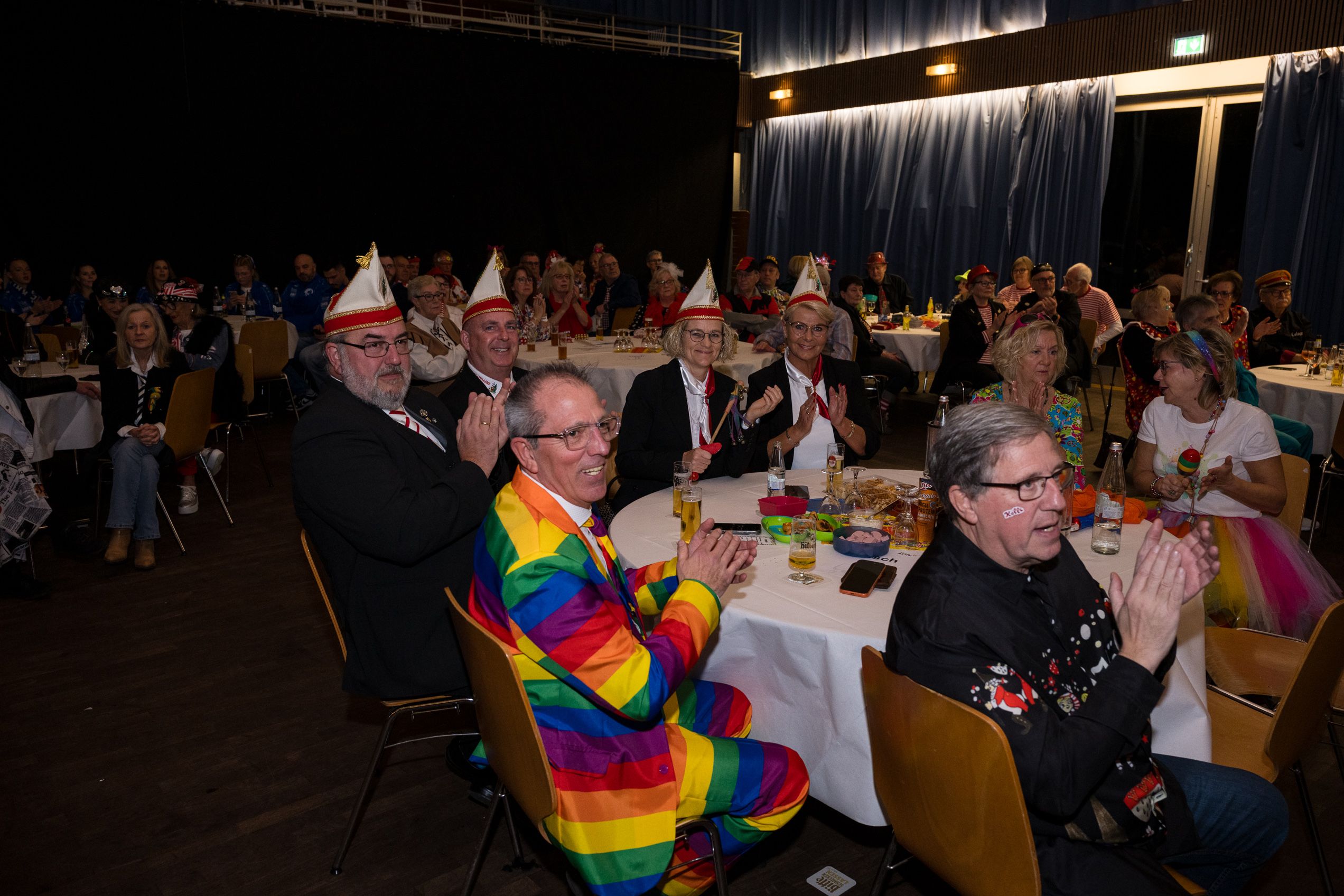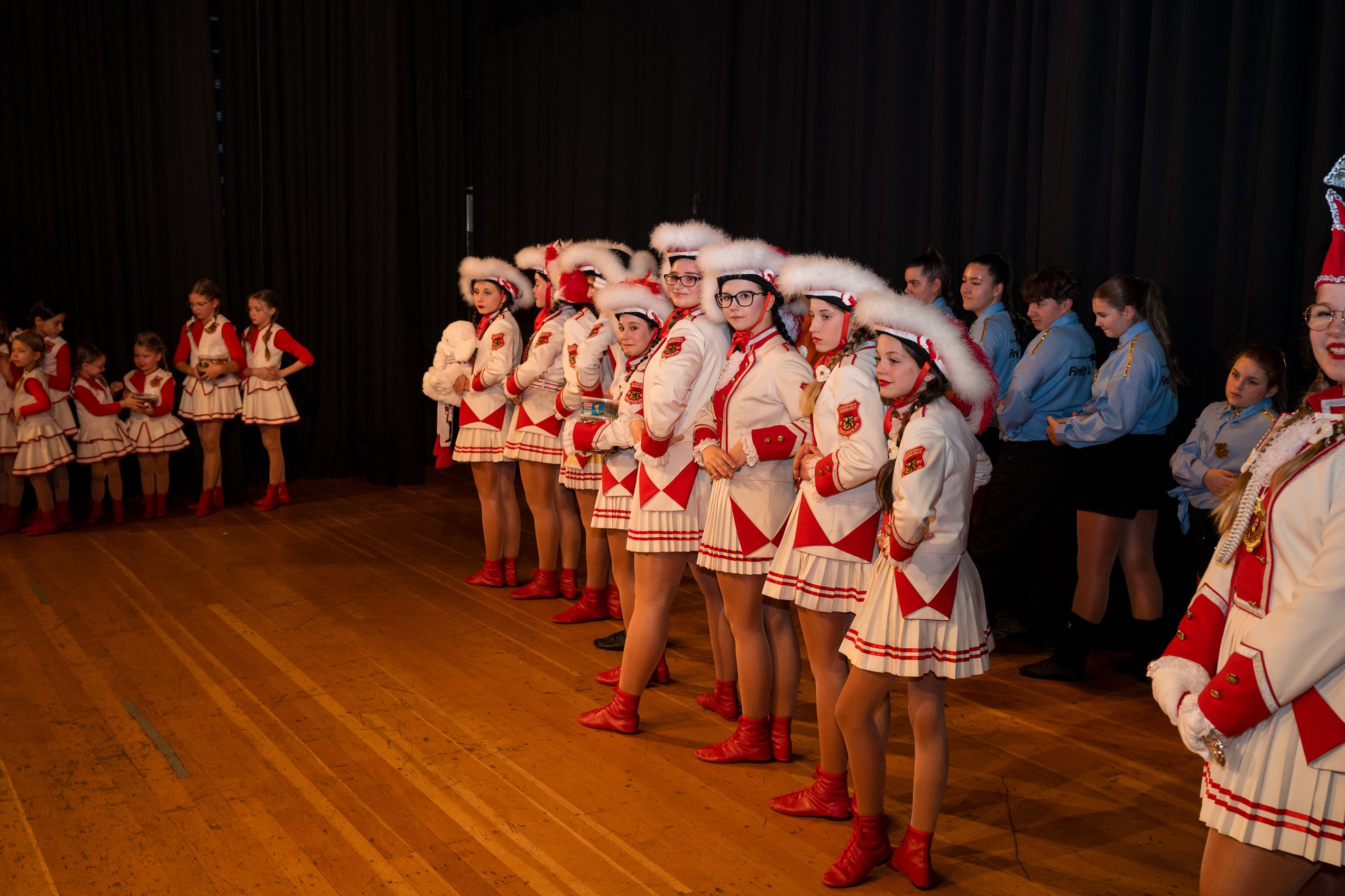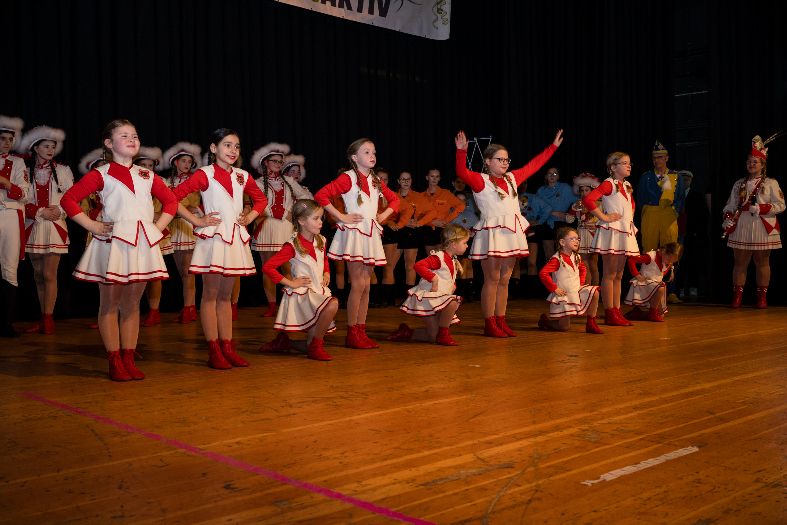 Auch 2026 war es wieder bewusst eine Wohnzimmersitzung mit rund 200 Gästen im großzügigen Saal der Festhalle Weisweiler – luftig und mit einem Publikum, das aufmerksam zuhört, aber auch mitgeht. Das Konzept ging erneut auf. Ein gut gelaunter und bestens über die auftretenden Künstler informierter Moderator führte durch das Programm, das traditionell aus Musik, Tanz und einer Büttenrede bestand. Eröffnet wurde das Programm von der Jugend des Garderegiments Weiß-Rot aus Eschweiler, angeführt von seiner souveränen Kinder-Präsidentin. Anschließend wurde es offiziell, Prinz Jürgen 1. Und sein Zeremonienmeister Pascal gaben sich mit Ihrem Gefolge die Ehre. Danach ging es weiter mit der Showtanzgruppe 4 step der Narrenzunft aus Eschweiler, die sich erst vor zwei Jahren gegründet hat, aber das Publikum mit der Darbietung und der Vielzahl der Tänzerinnen und Tänzer begeisterte. Als nächster Programmpunkt sorgten „Die Nothberger“ mit ihrem Entertrötment für phantastische Stimmung und holten das Publikum von den Stühlen. Etwas ruhiger ging es dann bei der Darbietung der Jugendtanzgruppe des TSC Gold Aachen weiter. Die Truppe, die mit ihrer Darbietung zurecht den Titel deutscher Vizemeister tragen darf, überzeugte mit einer einfühlsamen Darstellung.. Nach so viel hochklassigem Programm kam eine eingeplante Pause für mögliche Verzögerungen gerade recht. Durchatmen, die Kollegen und Bekannten am Nachbartisch begrüßen oder sich im Foyer stärken waren dann auch die hauptsächlichen Beschäftigungen der Gäste. Viel Zeit blieb jedoch nicht, der in Eschweiler noch nicht aufgetretene Büttenredner Björn Wassong alias „Ne Jeck im Rähn“ hatte das Publikum schnell wieder auf Betriebstemperatur und wurde mit Standing Ovations verabschiedet. Das TanzCorps Colonia Rut Wiess war bereits 2025 einer der Höhepunkte der BSG-Sitzung und konnte 2026 nahtlos an die grandiose Leistung anknüpfen. Akrobatik auf höchstem Niveau wurde vom Publikum mit langanhaltendem Applaus belohnt und wir sind sicher, dass diese Truppe nicht zum letzten Mal bei der BSG zu Gast war. Nach einer solchen Truppe aufzutreten ist nicht einfach, aber die Gesangstruppe „Bremsklötz“ aus Inden-Altdorf meisterte diese Herausforderung souverän. Die drei Herren sangen sich im und mit dem Publikum quer durch die bekanntesten Karnevalslieder der letzten Jahrzehnte und kamen ebenfalls nicht ohne Zugabe von der Bühne. Nach den Bremsklötz zog die Ehrengarde Köln 1902 e.V. auf und zeigte, dass man eine eigene Veranstaltung in Köln und einen zahlenmäßig großen Auftritt in Weisweiler durchaus parallel bestreiten kann. Die Referenz ans Publikum sowie die musikalischen und tänzerischen Darbietungen begeisterten das Publikum. Den Schlussakkord setzte dann wiederum das Tanzcorps Höppe Kroetsch, in deren Wohnzimmer die Sitzung stattfand. Mit gleich drei Tänzen begeisterte das Tanzcorps das Publikum und hielt die Stimmung bis zum Schluss hoch. Zum Ausmarsch wurde der Moderator noch zum Standartenträger gemacht und konnte somit standesgemäß die Bühne in Begleitung verlassen.